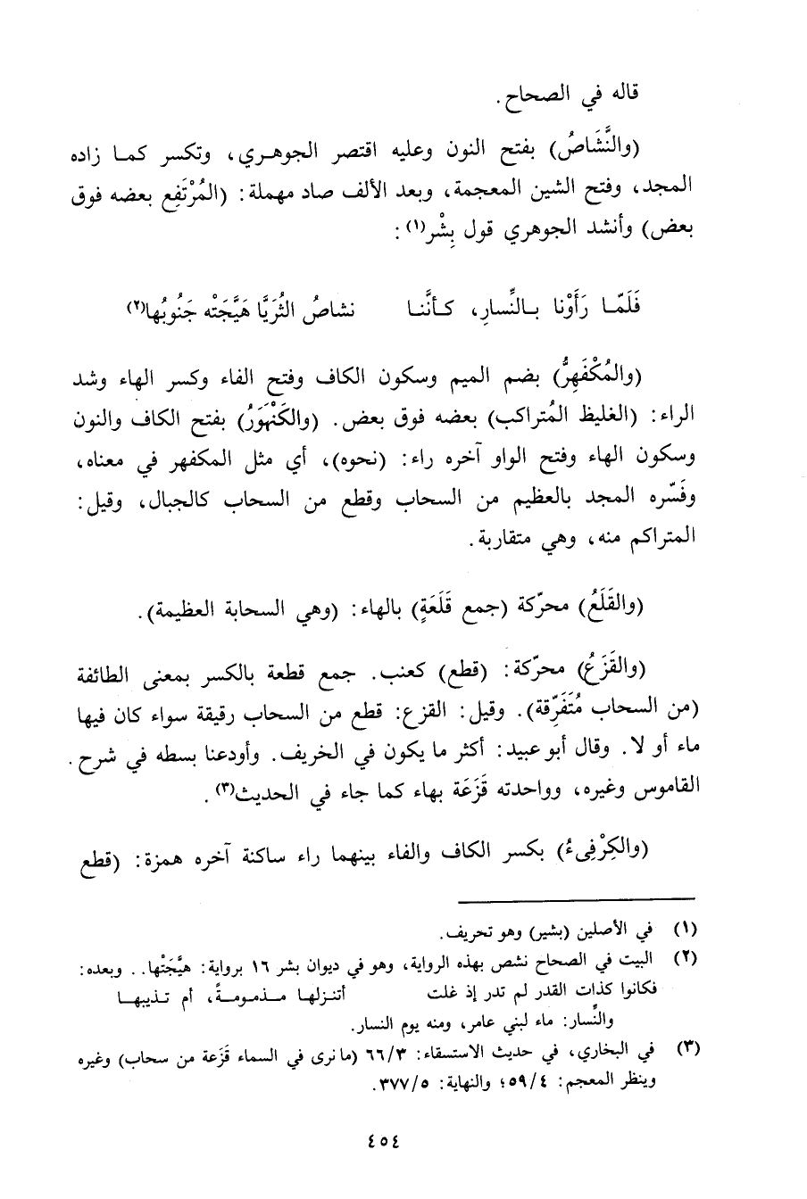 (والمكفهر) بضم الميم وسكون الكاف وفتح الفاء وكسر الهاء وشد الراء: (الغليظ المتراكب) بعضه فوق بعض. (والكنهور) بفتح الكاف والنون وسكون الهاء وفتح الواو آخره راء: (نحوه) , أي مثل المكفهر في معناه, وفسره المجد بالعظيم من السحاب وقطع من السحاب كالجبال, وقيل: المتراكم منه, وهي متقاربة.