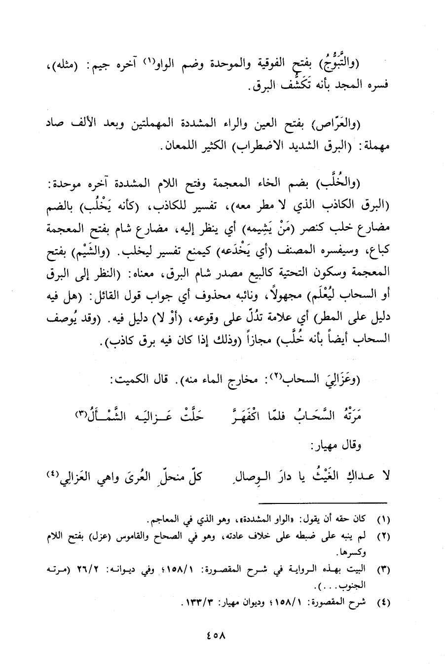 (والخلب) بضم الخاء المعجمة وفتح اللام المشددة آخره موحدة: (البرق الكاذب الذي لا مطر معه) , تفسير للكاذب, (كأنه يخلب) بالضم مضارع خلب كنصر (من يشيمه) أي ينظر إليه, مضارع شام بفتح المعجمة كباع, وسيفسره المصنف (أي يخدعه) كيمنع تفسير ليخلب. (والشيم) بفتح المعجمة وسكون التحتية كالبيع مصدر شام البرق, معناه: (النظر إلى البرق أو السحاب ليعلم) مجهولًا, ونائبه محذوف أي جواب قول القائل: (هل فيه دليل على المطر) أي علامة تدل على وقوعه, (أو لا) دليل فيه. (وقد يوصف السحاب أيضًا بأنه خلب) مجازًا (وذلك إذا كان فيه برق كاذب).