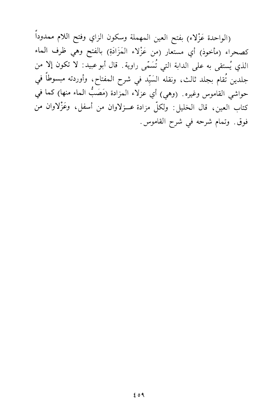 (الواحدة عزلاء) بفتح العين المهملة وسكون الزاي وفتح اللام ممدودًا كصحراء (مأخوذ) أي مستعار (من عزلاء المزادة) بالفتح وهي ظرف الماء الذي يستقى به على الدابة التي تسمى راوية. قال أبو عبيد: لا تكون إلا من جلدين تقام بجلد ثالث, ونقله السيد في شرح المفتاح, وأوردته مبسوطًا في حواشي القاموس وغيره. (وهي) أي عزلاء المزادة (مصب الماء منها) كما في كتاب العين, قال الخليل: ولكل مزادة عزلاوان من أسفل, وعزلاوان من فوق. وتمام شرحه في شرح القاموس.