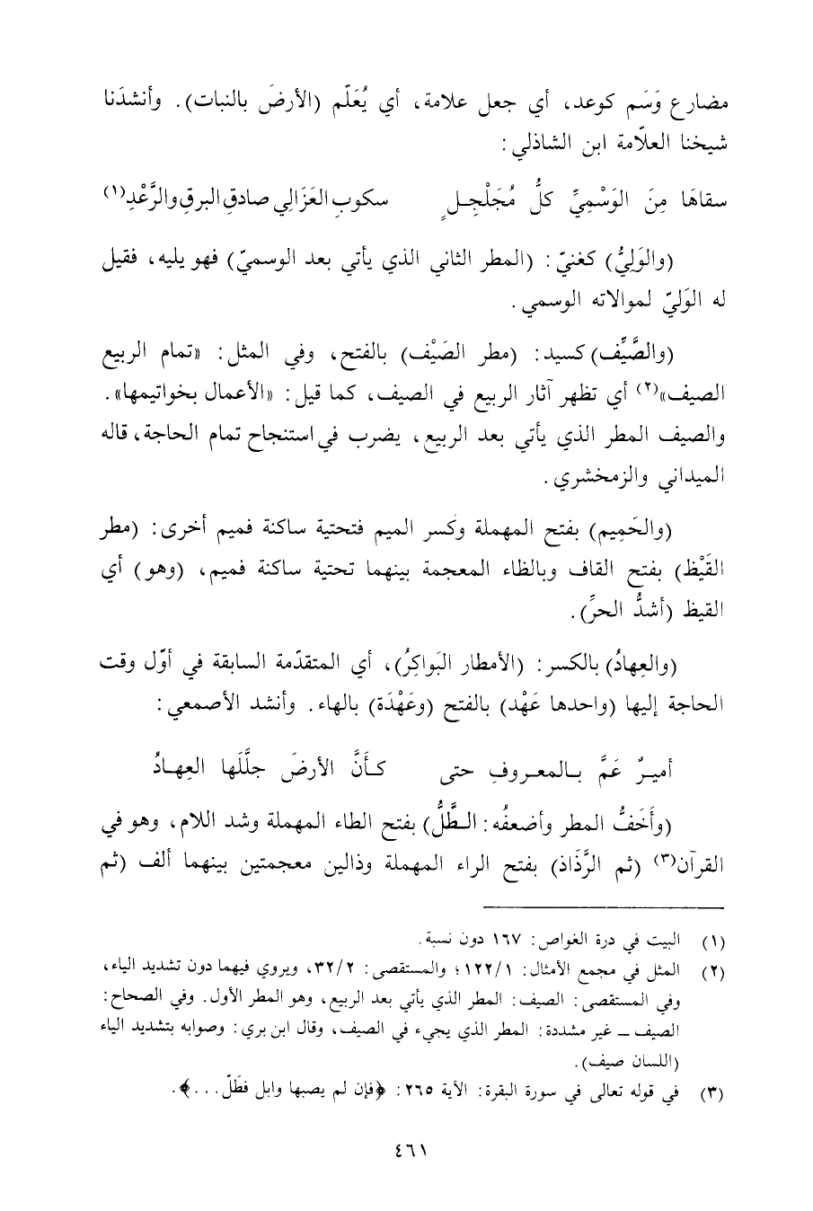 (وأخف المطر وأضعفه: الطل) بفتح الطاء المهملة وشد اللام, وهو في القرآن (ثم الرذاذ) بفتح الراء المهملة وذالين معجمتين بينهما ألف (ثم