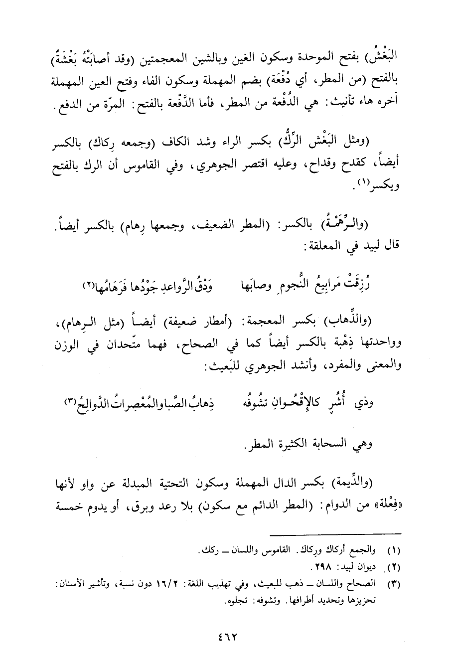 (والذهاب) بكسر المعجمة: (أمطار ضعيفة) أيضًا (مثل الرهام) , وواحدتها ذهبة بالكسر أيضًا كما في الصحاح, فهما متحدان في الوزن والمعنى والمفرد, وأنشد الجوهري للبعيث: