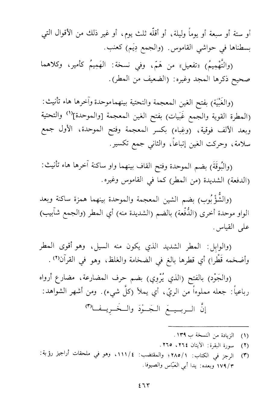(والغيبة) بفتح الغين المعجمة والتحتية بينهما موحدة وآخرها هاء تأنيث: (المطرة القوية واةلجمع غبيات) بفتح الغين المعجمة [والموحدة] والتحتية وبعد الألف فوقية, (وغباء) بكسر المعجمة وفتح الموحدة, الأول جمع سلامة, وحركت الغين إتباعًا, والثاني جمع تكسير.