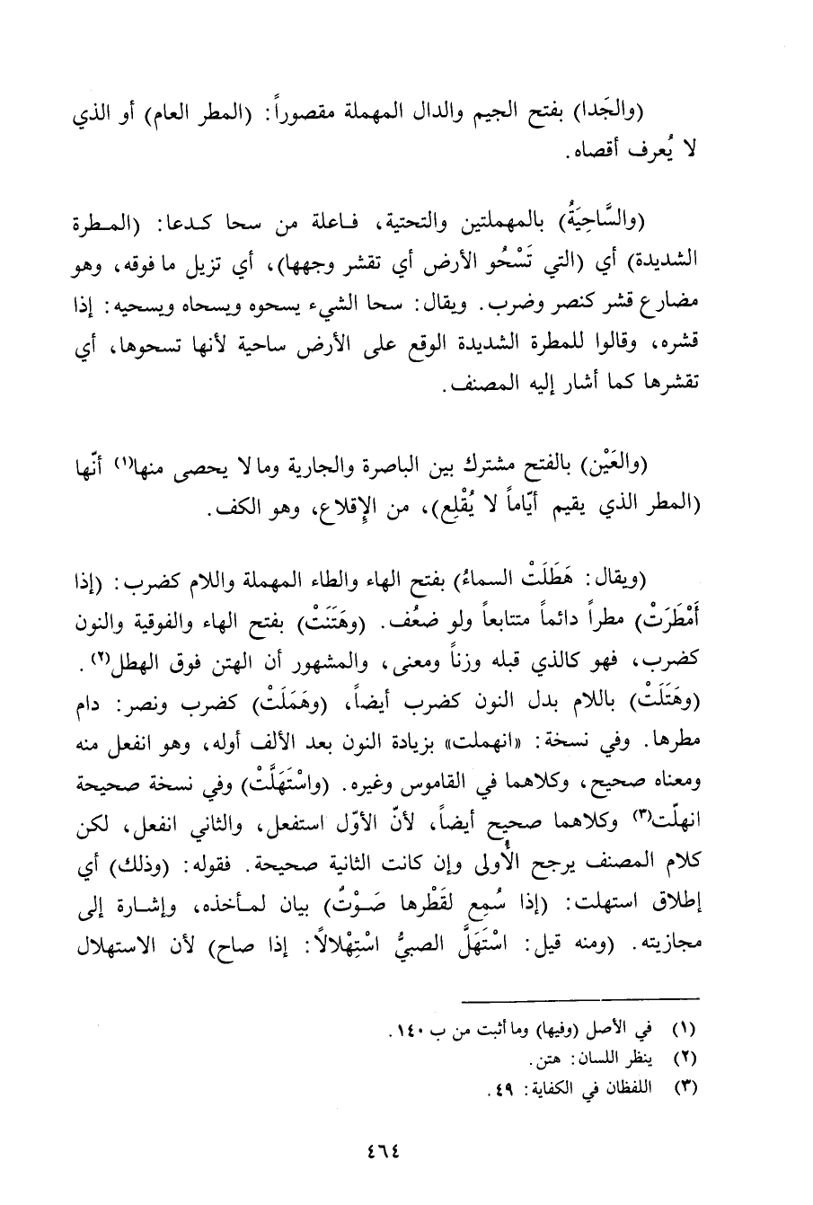 (ويقال: هطلت السماء) بفتح الهاء والطاء المهملة واللام كضرب: (إذا أمطرت) مطرًا دائمًا متتابعًا ولو ضعف. (وهتنت) بفتح الهاء والفوقية والنون كضرب, فهو كالذي قبله وزنًا ومعنى, والمشهور أن الهتن فوق الهطل. (وهتلت) باللام بدل النون كضرب أيضًا, (وهملت) كضرب ونصر: دام مطرها. وفي نسخة: «انهملت» بزيادة النون بعد الألف أوله, وهو انفعل منه ومعناه صحيح, وكلاهما في القاموس وغيره. (واستهلت) وفي نسخة صحيحة انهلت وكلاهما صحيح أيضًا, لأن الأول استفعل, والثاني انفعل, لكن كلام المصنف يرجح الأولى وإن كانت الثانية صحيحة. فقوله: (وذلك) أي إطلاق استهلت: (إذا سمع لقطرها صوت) بيان لمأخذه, وإشارة إلى مجازيته. (ومنه قيل: استهل الصبي استهلالًا: إذا صاح) لأن الاستهلال