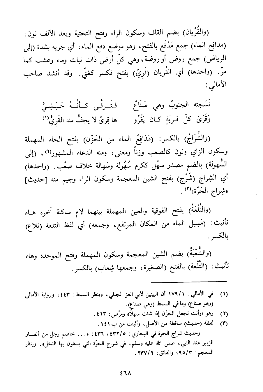 (والقريان) بضم القاف وسكون الراء وفتح التحتية وبعد الألف نون: (مدافع الماء) جمع مدفع بالفتح, وهو موضع دفع الماء, أي جريه بشدة (إلى الرياض) جمع روض أو روضة, وهي كل أرض ذات نبات وماء وعشب كما مر. (واحدها) أي القريان (قري) بفتح فكسر كغني. وقد أنشد صاحب الأمالي: