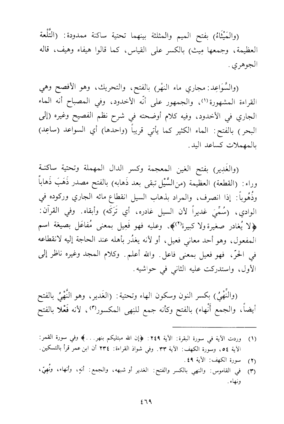 (والغدير) بفتح الغين المعجمة وكسر الدال المهملة وتحتية ساكنة وراء: (القطعة) العظيمة (من السيل تبقى بعد ذهابه) بالفتح مصدر ذب ذهابًا وذهوبًا: إذا انصرف, والمراد بذهاب السيل انقطاع مائه الجاري وركوده في الوادي, (سمي غديرًا لأن السيل غادره, أي تركه) وأبقاه. وفي القرآن: {لا يغادر صغيرة ولا كبيرة} , وعليه فهو فعيل بمعنى مفاعل بصيغة اسم المفعول, وهو أحد معاني فعيل, أو لأنه يغدر بأهله عند الحاجة إليه لانقطاعه في الحر, فهو فعيل بمعنى فاعل. والله أعلم. وكلام المجد وغيره ناظر إلى الأول, واستدركت عليه الثاني في حواشيه.