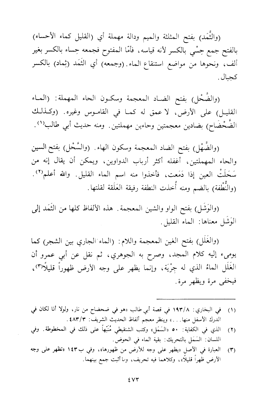 (والضهل) بفتح الضاد المعجمة وسكون الهاء. (والسحل) بفتح السين والحاء المهملتين, أغفله أكثر أرباب الدواوين, ويمكن أن يقال إنه من سحلت العين إذا دمعت, فأخذوا منه اسم الماء القليل. والله أعلم.