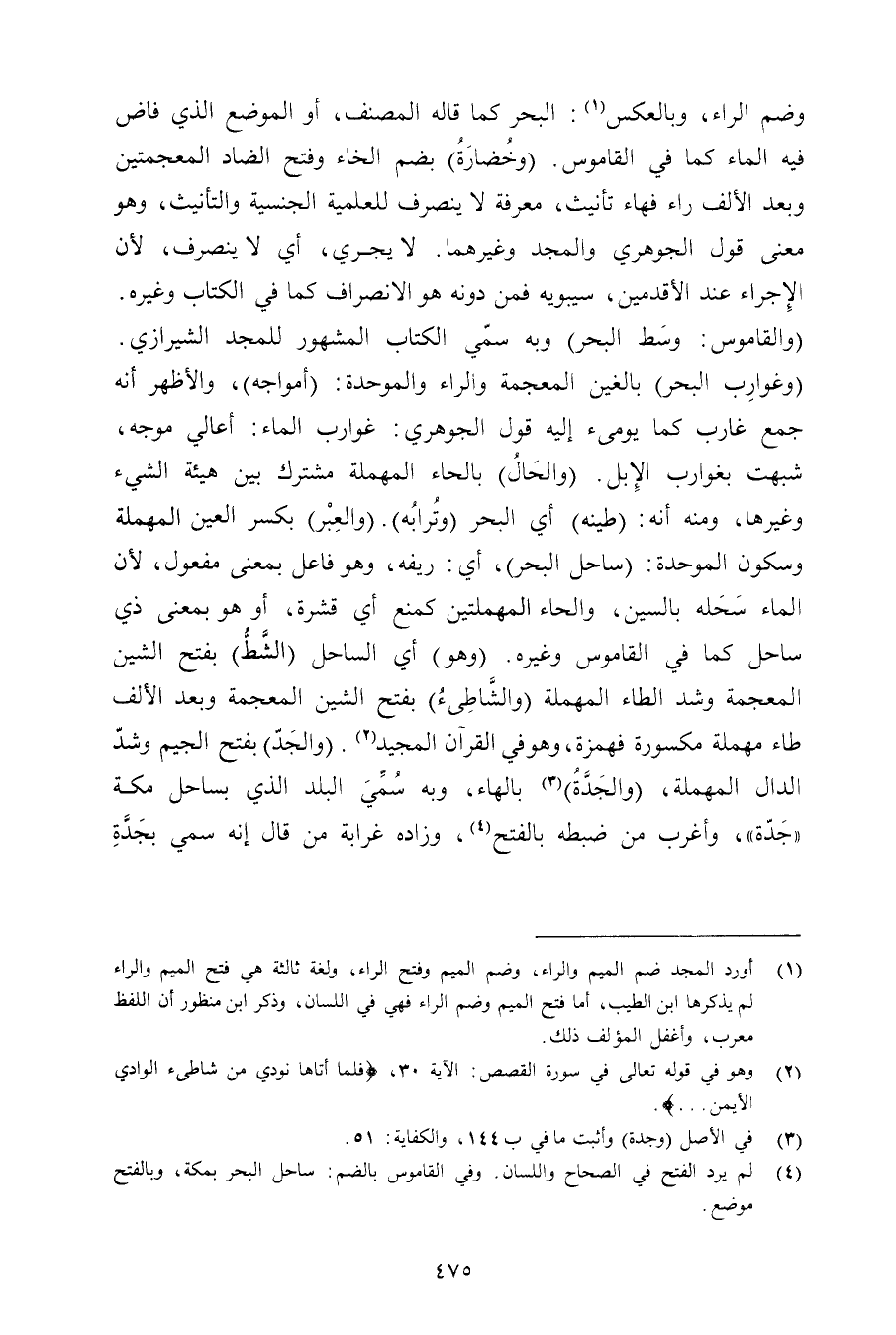 وضم الراء, وبالعكس: البحر كما قاله المصنف, أو الموضع الذي فاض فيه الماء كما في القاموس. (وخضارة) بضم الخاء وفتح الضاد المعجمتين وبعد الألف راء فهاء تأنيث, معرفة لا ينصرف للعلمية الجنسية والتأنيث, وهومعنى قول الجوهري والمجد وغيرهما. لا يجري, أي لا ينصرف, لأن الإجراء عند الأقدمين, سيبويه فمن دونه هو الانصارف كما في الكتاب وغيره. (والقاموس: وسط البحر) وبه سمي الكتاب المشهور للمجد الشيرازي. (وغوارب البحر) بالغين المعجمة والراء والموحدة: (أمواجه) , والأظهر أنه جمع غارب كما يومئ إليه قول الجوهري: غوارب التماء: أعالي موجه, شبهت بغوارب الإبل. (والحال) بالحاء المهملة مشترك بين هيئة الشيء وغيرها, ومنه أنه: (طينه) أي البحر (وترابه). (والعبر) بكسر العين المهملة وسكون الموحدة: (ساحل البحر) , أي: ريفه, وهو فاعل بمعنى مفعول, لأن الماء سحله بالسين, والحاء المهملتين كمنع أي قشرة, أو هو بمعنى ذي ساحل كما في القاموس وغيره. (وهو) أي الساحل (الشط) بفتح الشين المعجمة وشد الطاء المهملة (والشاطئ) بفتح الشين المعجمة وبعد الألف طاء مهملة مكسورة فهمزة, وهو في القرآن المجيد. (والجد) بفتح الجيم وشد الدال المهملة, (والجدة) بالهاء, وبه سمي البلد الذي بساحل مكة «جدة» , وأغرب من ضبطه بالفتح, وزاده غرابة من قال إنه سمي بجدة