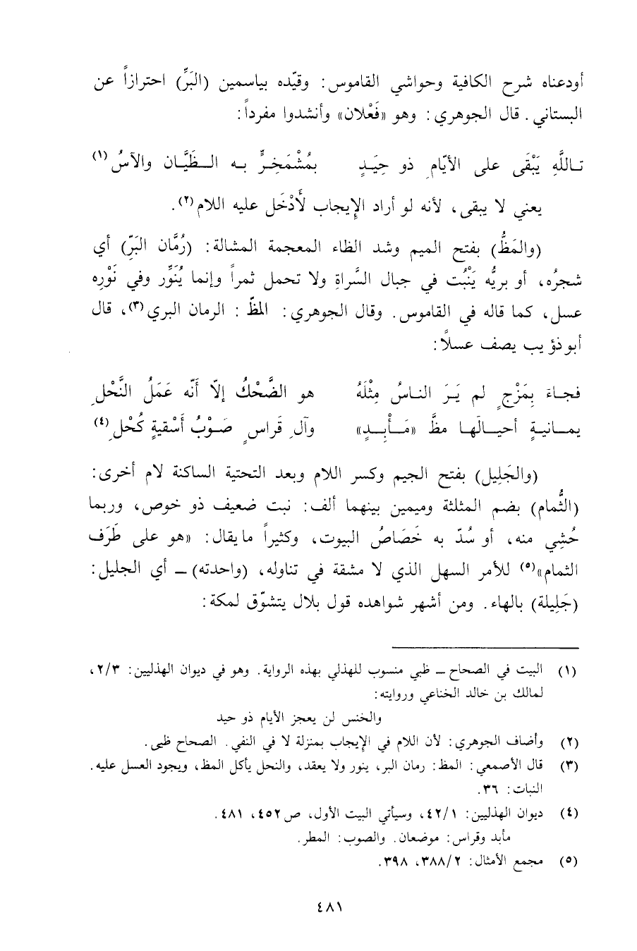 (والجليل) بفتح الجيم وكسر اللام وبعد التحتية الساكنة لام أخرى: (الثمام) بضم المثلثة وميمين بينهما ألف: نبت ضعيف ذو خوص, وربما حشى منه, أو سد به خصاص البيوت, وكثيرًا ما يقال: «هو على طرف الثمام» للأمر السهل الذي لا مشقة في تناوله, (واحدته) - أي الجليل: (جليلة) بالهاء. ومن أشهر شواهده قول بلال يتشوق لمكة: