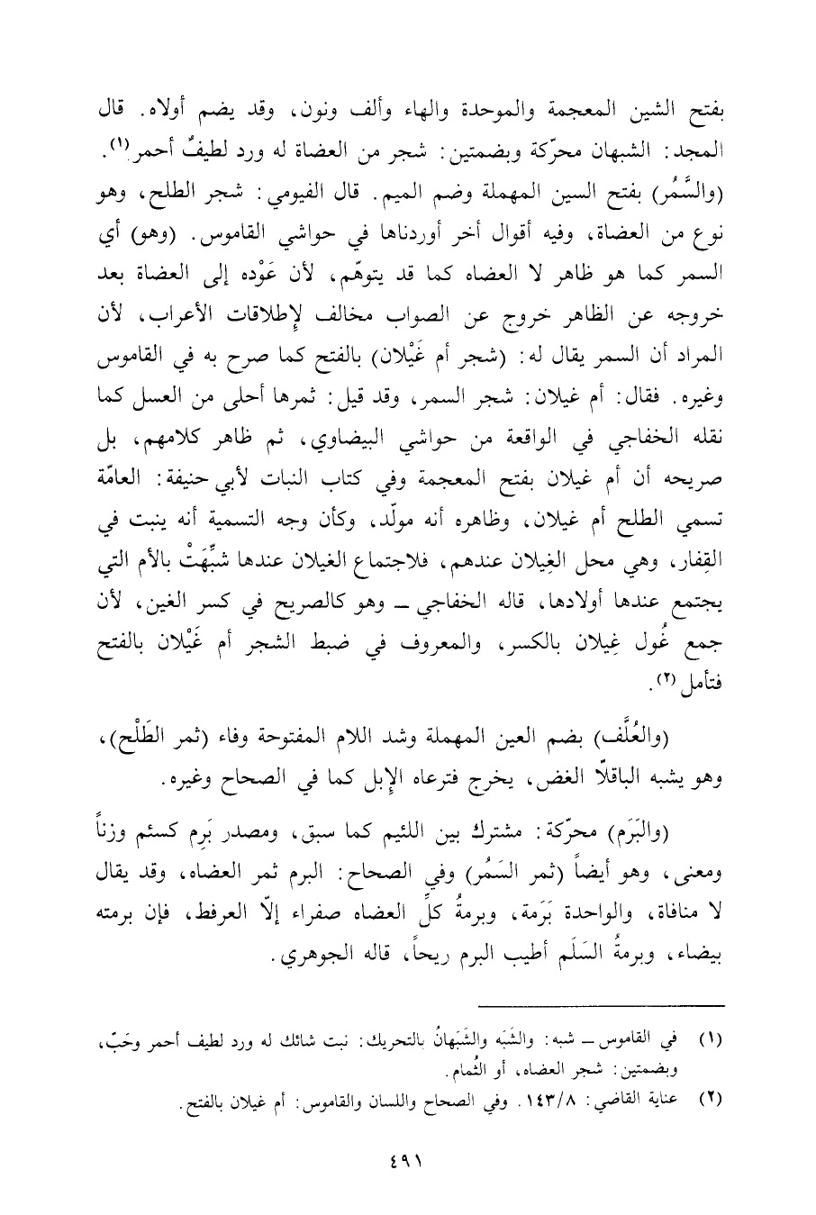 بفتح الشين المعجمة والموحدة والهاء وألف ونون, وقد يضم أولاه. قال المجد: الشبهان محركة وبضمتين: شجر من العضاة له ورد لطيف أحمر. (والسمر) بفتح السين المهملة وضم الميم. قال الفيومي: شجر الطلح, وهو نوع من العضاة, وفيه أقوال أخر أوردناها في حواشي القاموس. (وهو) أي السمر كما هو ظاهر لا العضاه كما قد يتوهم, لأن عوده إلى العضاة بعد خروجه عن الظاهر خروج عن الصواب مخالف لإطلاقات الأعراب, لأن المراد أن السمر يقال له: (شجر أم غيلان) بالفتح كما صرح به في القاموس وغيره. فقال: أم غيلان: شجر السمر, وقد قيل: ثمرها أحلى من العسل كما نقله الخفاجي في الواقعة من حواشي البيضاوي, ثم ظاهر كلامهم, بل صريحه أن أم غيلان بفتح المعجمة وفي كتاب النبات لأبي حنيفة: العامة تسمي الطلح أم غيلان, وظاهره أنه مولد, وكأن وجه التسمية أنه ينبت في القفار, وهي محل الغيلان عندهم, فلاجتماع الغيلان عندها شبهت بالأم التي يجتمع عندها أولادها, قاله الخفاجي - وهو كالصريح في كسر الغين, لأن جمع غول غيلان بالكسر, والمعروف في ضبط الشجر أم غيلان بالفتح فتأمل.