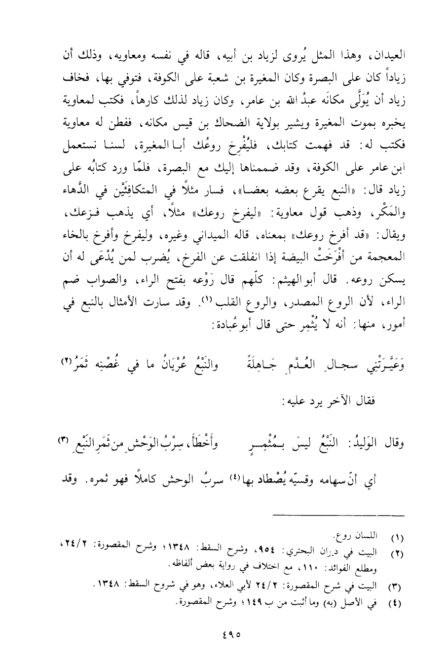 العيدان, وهذا المثل يروى لزياد بنأبيه, قاله في نفسه ومعاويه, وذلك أن زيادًا كان على البصرة وكان المغيرة بن شعبة على الكوفة, فتوفي بها, فخاف زياد أن يولى مكانه عبد الله بن عامر, وكان زياد لذلك كارهًا, فكتب لمعاوية يخبره بموت المغيرة ويشير بولاية الضحاك بن قيس مكانه, ففطن له معاويةو فكتب له: قد فهمت كتابك, فليفرخ روعك أبا المغيرة, لسنا نستعمل ابن عامر على الكوفة, وقد ضممناها إليك مع البصرة, فلما ورد كتابه على زياد قال: «النبع يقرع بعضه بعضا» , فسار مثلًا في المتكافئين في الدهاء والمكر, وذهب قول معاوية: «ليفرخ روعك» مثلًا, أي يذهب فزعك, ويقال: «قد أفرخ روعك» بمعناه, قاله الميداني وغيره, وليفرخ وأفرخ بالخاء المعجمة من أفرخت البيضة إذا انفلقت عن الفرخ, يضرب لمن يدعى له أن يسكن روعه. قال أبو الهيثم: كلهم قال روعه بفتح الراء, والصواب ضم الراء, لأن الروع المصدر, والروع القلب. وقد سارت الأمثال بالنبع في أمور, منها: أنه لا يثمر حتى قال أبو عبادة: