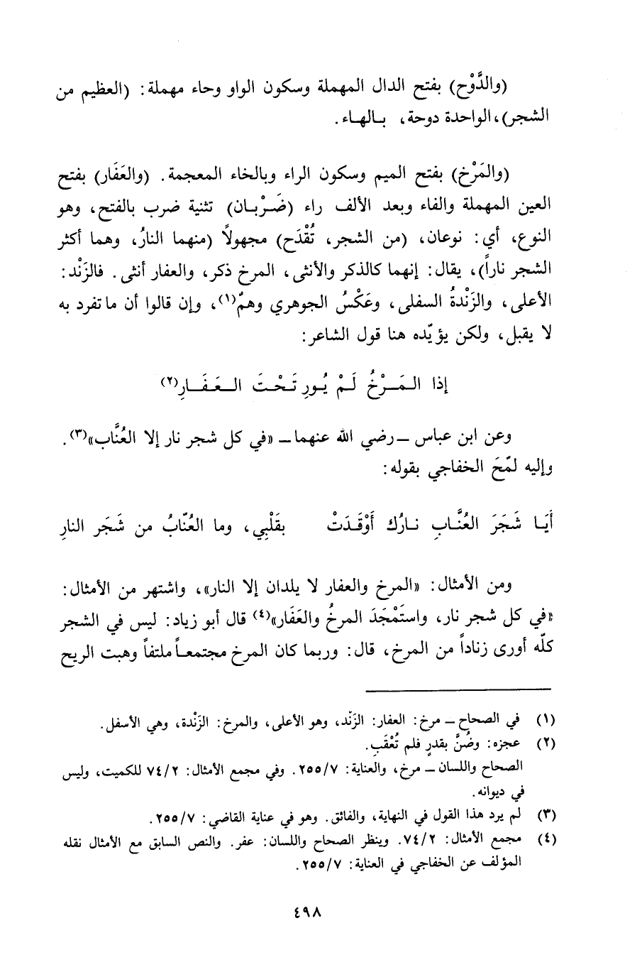 (والمرخ) بفتح الميم وسكون الراء وبالخاء المعجمة. (والعفار) بفتح العين المهملة والفاء وبعد الألف راء (ضربان) تثنية ضرب بالفتح, وهو النوع, أي: نوعان (من الشجر, تقدح) مجهولًا (منهما النار, وهما أكثر الشجر نارًا) , يقال: إنهما كالذكر والأنثى, المرخ ذكر, والعفار أنثى. فالزند: الأعلى, والزندة السفلى, وعكس الجوهري وهم, وإن قالوا أن ما تفرد به لا يقبل, ولكن يؤيده هنا قول الشاعر: