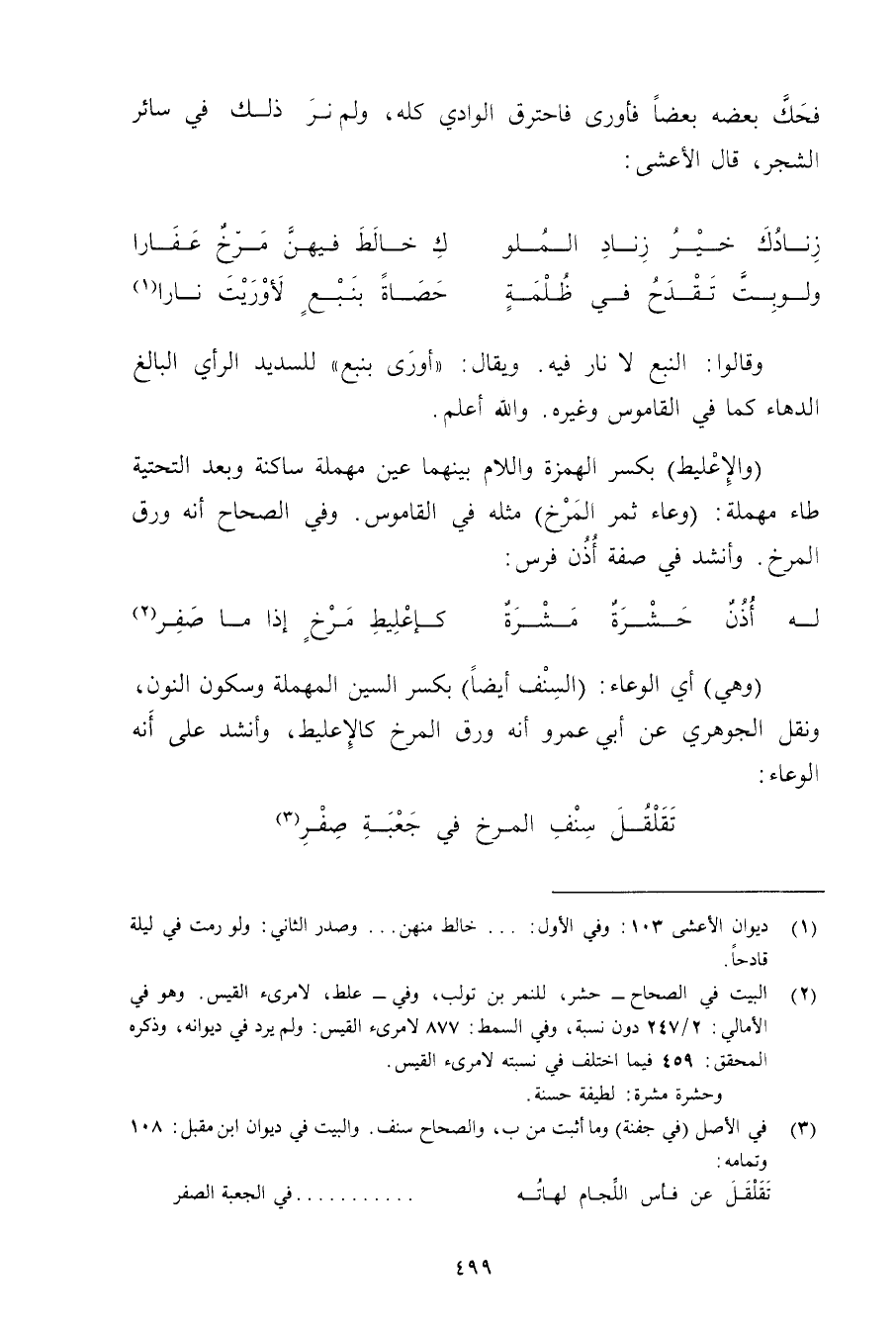 فحك بعضه بعضًا فأورى فاحترق الوادي كله, ولم نر ذلك في سائر الشجر, قال الأعشى: