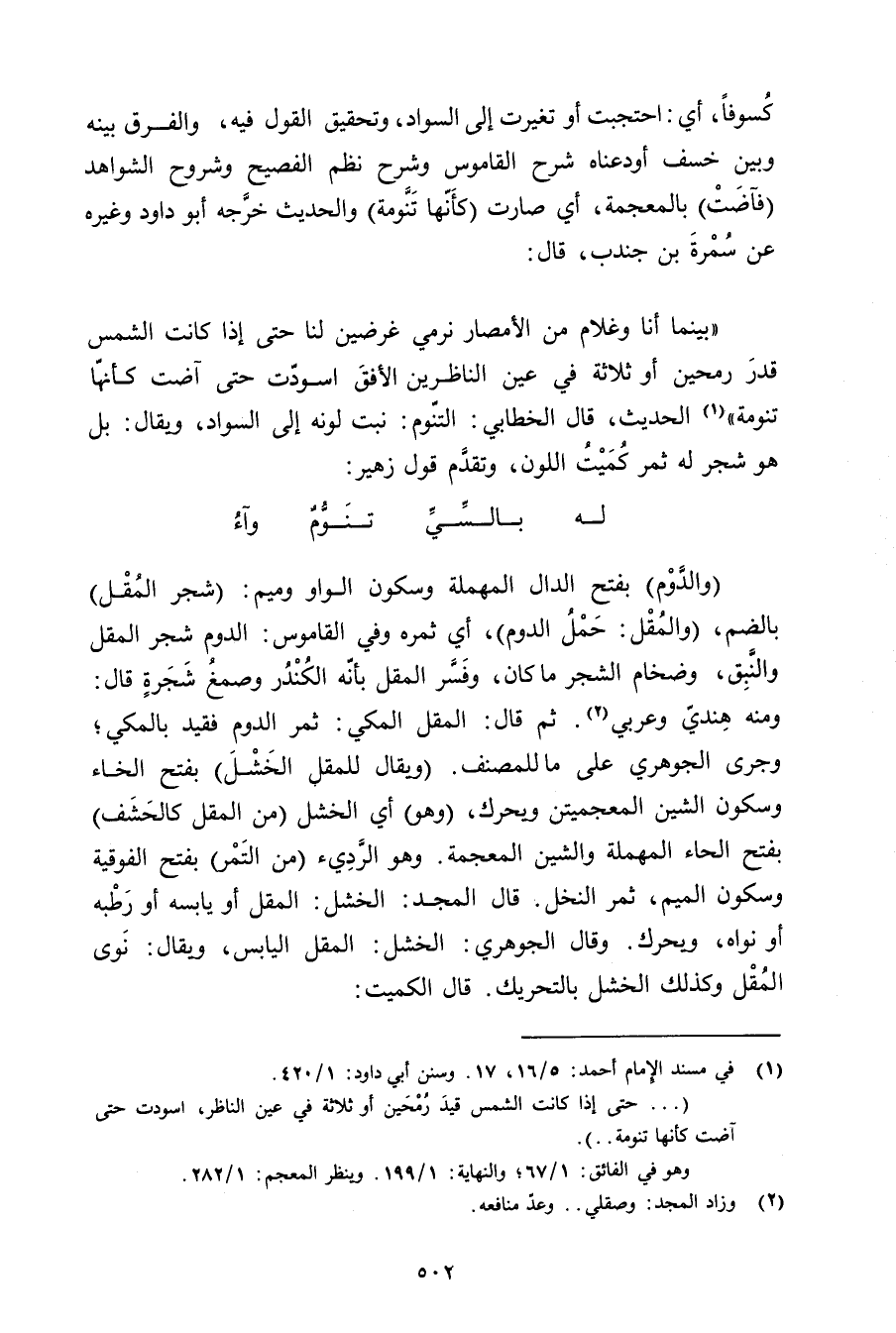 «بينما أنا وعلام من الأمصار نرمي غرضين لنا حتى إذا كانت الشمس قدر رمحين أو ثلاثة في عين الناظرين الأفق اسودت حتى آضت كأنها تنومة» الحديث, قال الخطابي: التنوم: نبت لونه إلى السواد, ويقال: بل هو شجر له ثمر كميت اللون, وتقدم قول زهير: