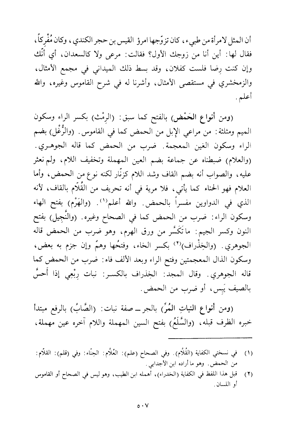 (ومن أنواع الحمض) بالفتح كما سبق: (الرمث) بكسر الراء وسكون الميم ومثلثة: من مراعي الإبل من الحمض كما في القاموس. (والرغل) بضم الراء وسكون الغين المعجمة. ضرب من الحمض كما قاله الجوهري. (والعلام) ضبطناه عن جماعة بضم العين المهملة وتخفيف اللام, ولم نعثر عليه, والصواب أنه بضم القاف وشد اللام كزنار لكنه نوع من الحمض, وأما العلام فهو الحناء كما يأتي, فلا مرية في أنه تحريف من القلام بالقاف, لأنه الذي في الدواوين مفسرًا بالحمض. والله أعلم. (والهرم) بفتح الهاء وسكون الراء: ضرب من الحمض كما في الصحاح وغيره. (والنجيل) بفتح النون وكسر الجيم: ما تكسر من ورق الهرم, وهو ضرب من الحمض قاله الجوهري. (والخذراف) بكسر الخاء, وفتحها وهم وإن جزم به بعض, وسكون الذال المعجمتين وفتح الراء وبعد الألف فاء: ضرب منالحمض كما قاله الجوهري. وقال المجد: الخذراف بالكسر: نبات ربعي إذا أحس بالصيف يبس, أو ضرب من الحمض.