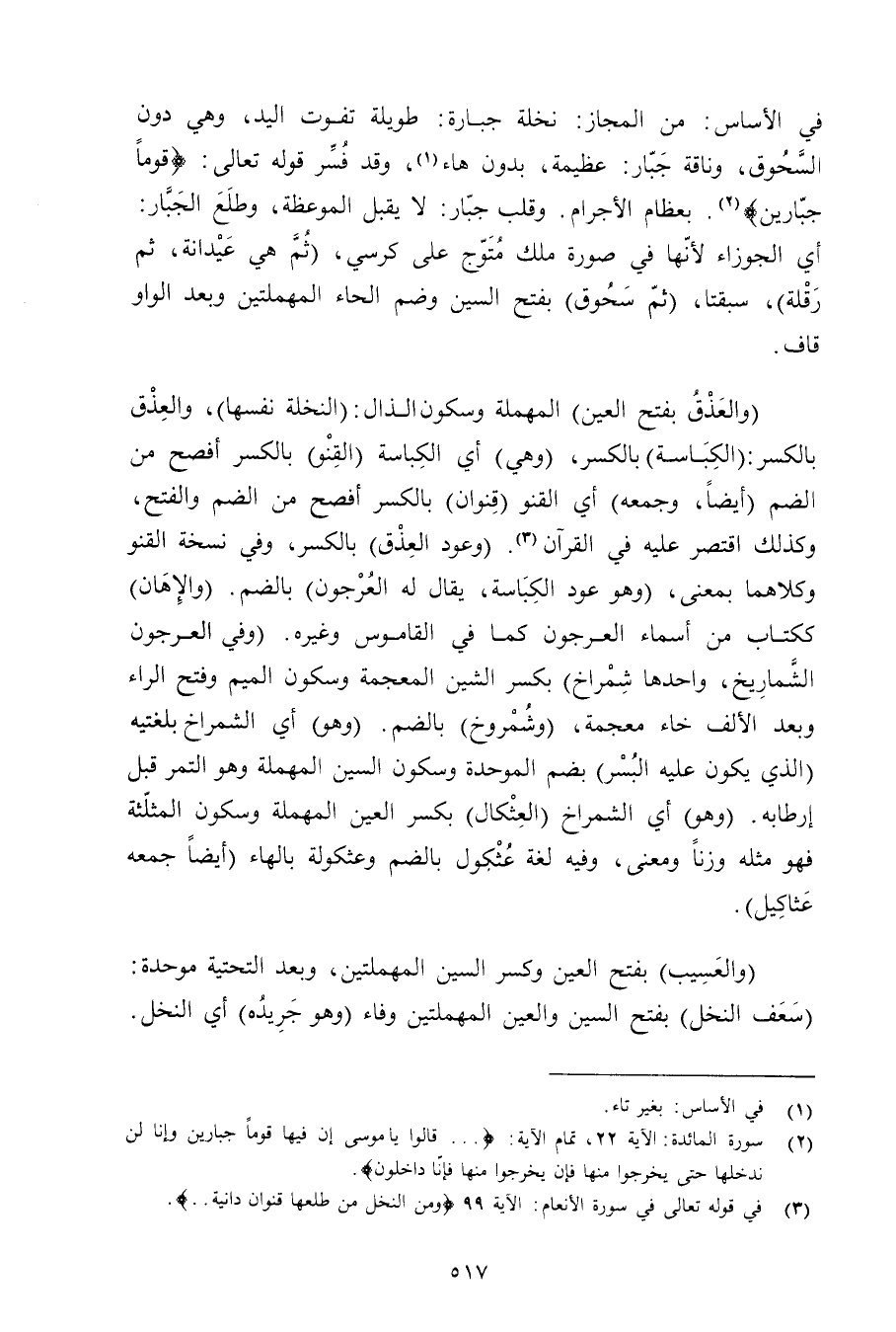 في الأساس: من المجاز: نخلة جبارة: طويلة تفوت اليد, وهي دون السحوق, وناقة جبار: عظيمة, بدون هاء, وقد فسر قوله تعالى: {قومًا جبارين}. بعظام الأجرام. وقلب جبار: لا يقبل الموعظة, وطلع الجبار: أي الجوزاء لأنها في صورة ملك متوج على كرسي, (ثم هي عيدانة, ثم رقلة) , سبقتا, (ثم سحوق) بفتح السين وضم الحاء المهملتين وبعد الواو قاف.