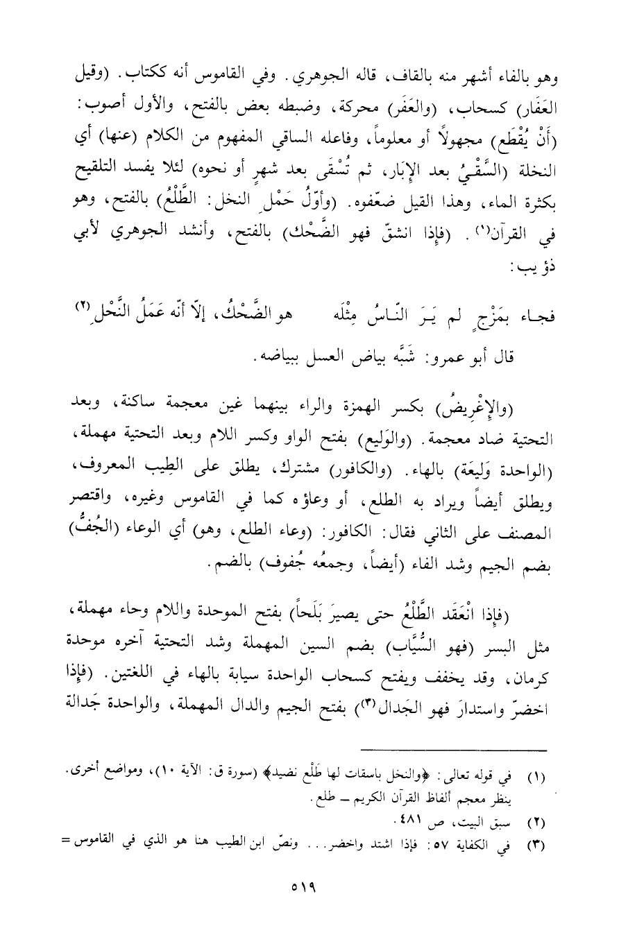 وهو بالفاء أشهر منه بالقاف, قاله الجوهري. وفي القاموس أنه ككتاب. (وقيل العفار) كسحاب, (والعفر) محركة, وضبطه بعض بالفتح, والأول أصوب: (أن يقطع) مجهولًا أو معلومًا, وفاعله الساقي المفهوم من الكلام (عنها) أي النخلة (السقي بعد الإبار, ثم تسقى بعد شهرٍ أو نحوه) لئلا يفسد التلقيح بكثرة الماء, وهذا القيل ضعفوه. (وأول حمل النخل: الطلع) بالفتح, وهو في القرآن. (فإذا انشق فهو الضحك) بالفتح, وأنشد الجوهري لأبي ذؤيب:
