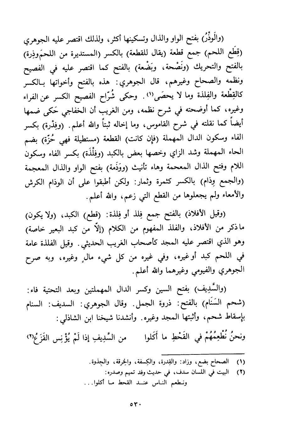 (والوذر) بفتح الواو والذال وتسكينها أكثر, ولذلك اقتصر عليه الجوهري (قطع اللحم) جمع قطعة (يقال للقطعة) بالكسر (المستديرة من اللحم وذرة) بالفتح والتحريك (ونصحة, وبضعة) بالفتح كما اقتصر عليه في الفصيح ونظمه والصحاح وغيرهم, قال الجوهري: هذه بالفتح وأخواتها بالكسر كالقطعة والفلذة وما لا يحصى. وحكى شراح الفصيح الكسر عن الفراء وغيره, كما أوضحته في شرح نظمه, ومن الغريب أن الخفاجي حكى ضمها أيضًا كما نقلته في شرح القاموس, وما إخاله ثبتًا والله أعلم. (وفدرة) بكسر الفاء وسكون الدال المهملة (فإن كانت) القطعة (مستطيلة فهي حزة) بضم الحاء المهملة وشد الزاي وخصها بعض بالكبد (وفلذة) بكسر الفاء وسكون اللام وفتح الذال المعجمة وهاء تأنيث (ووذمة) بفتح الواو والذال المعجمة (والجمع وذام) بالكسر كثمرة وثمار: ولكن أطبقوا على أن الوذام الكرش والأمعاء ولم يجعلوها من القطع التي زعم, والله أعلم.