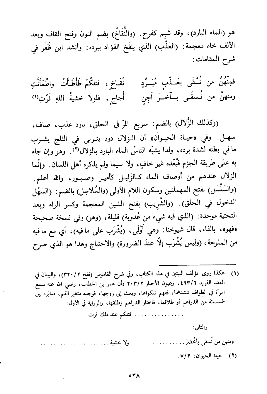 (وكذلك الزلال) بالضم: سريع المر في الحلق, بارد عذب, صاف, سهل. وفي «حياة الحيوان» أن الزلال دود يتربى في الثلج يشرب ما في بطنه لشدة برده, ولذا يشبه الناس الماء البارد بالزلال. وهو وإن جاء به عن طريقة الجزم فبعده غير خافٍ, ولا سيما ولم يذكره أهل اللسان. وإنما الزلال عندهم من أوصاف الماء كالزليل كأمير وصبور, والله أعلم. (والسلسل) بفتح المهملتين وسكون اللام الأولى (والسلاسل) بالضم: (السهل الدخول في الحلق). (والشريب) بفتح الشين المعجمة وكسر الراء وبعد التحتية موحدة: (الذي فيه شيء من عذوبة) قليلة, (وهو) وفي نسخة صحيحة «فهو» , بالفاء, قال شيوخنا: وهي أولى, (يشرب على ما فيه) , أي مع ما فيه من الملوحة, (وليس يشرب إلا عند الضرورة) والاحتياج وهذا هو الذي صرح