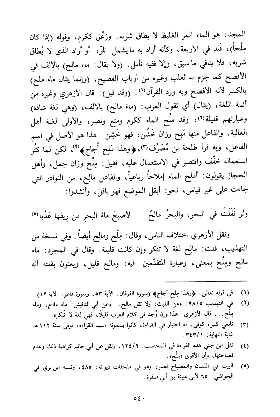 ونقل الأزهري اختلاف الناس, وقال: ملح ومالح أيضًا. وفي نسخة من التهذيب, قلت: مالح لغة لا تنكر وإن كانت قليلة. وقال في المجرد: ماء مالح وملح بمعنى, وعبارة المتقدمين فيه: ومالح قليل, ويعنون بقلته أنه