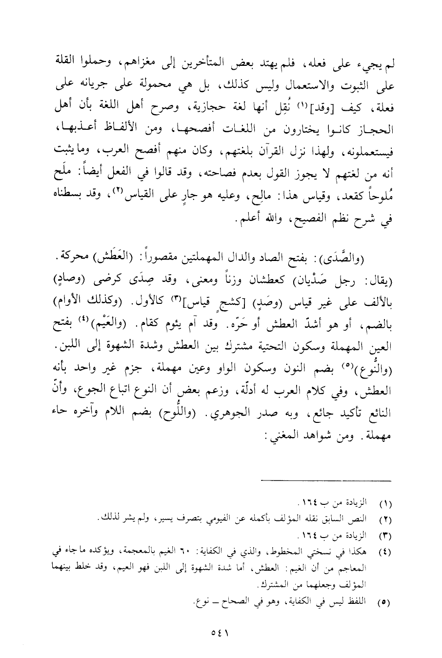 لم يجيء على فعله, فلم يهتد بعض المتأخرين إلى مغزاهم, وحملوا القلة على الثبوت والاستعمال وليس كذلك, بل هي محمولة على جريانه على فعلة, كيف [وقد] نقل أنها لغة حجازية, وصرح أهل اللغة بأن أهل الحجاز كانوا يختارون من اللغات أفصحها, ومن الألفاظ أعذبها, فيستعملونه, ولهذا نزل القرآن بلغتهم, وكان منهم أفصح العرب, وما يثبت أنه من لغتهم لا يجوز القول بعدم فصاحته, وقد قالوا في الفعل أيضًا: ملح ملوحًا كقعد, وقياس هذا: مالح, وعليه هو جارٍ على القياس, وقد بسطناه في شرح نظم الفصيحو والله أعلم.