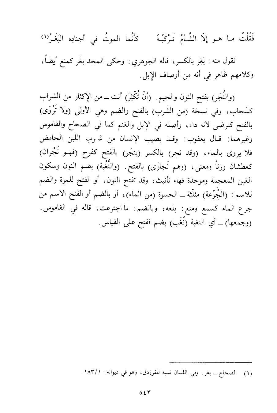 (والنجر) بفتح النون والجيم. (أن تكثر) أنت - من الإكثار من الشراب كسحاب, وفي نسخة (من الشرب) بالفتح والضم وهي الأولى (ولا تروى) بالفتح كترضى لأنه داء, وأصله في الإبل والغنم كما في الصحاح والقاموس وغيرهما: قال يعقوب: وقد يصيب الإنسان من شرب اللبن الحامض فلا يروى بالماء, (وقد نجر) بالكسر (ينجر) بالفتح كفرح (فهو نجران) كعطشان وزنًا ومعنى, (وهم نجارى) بالفتح. (والنغبة) بضم النون وسكون الغين المعجمة وموحدة فهاء تأنيث, وقد تفتح النون, أو الفتح للمرة والضم للاسم: (الجرعة) مثلثة - الحسوة (من الماء) , أو بالضم أو الفتح الاسم من جرع الماء كسمع ومنع: بلعه, وبالضم: ما اجترعت, قاله في القاموس. (وجمعها) - أي النغبة (نغب) بضم ففتح على القياس.