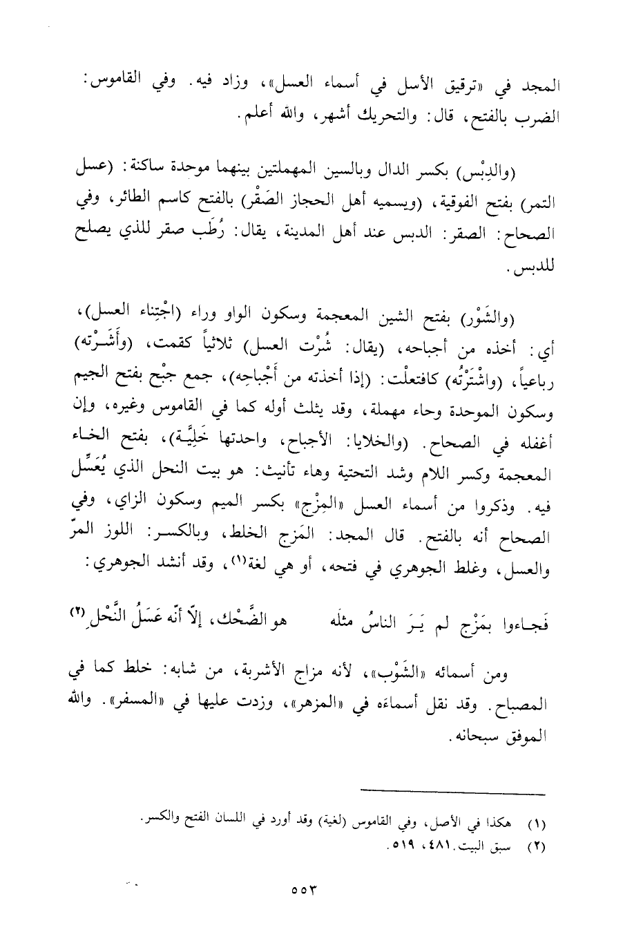 المجد في «ترقيق الأسل في أسماء العسل» , وزاد فيه. وفي القاموس: الضرب بالفتح, قال: والتحريك أشهر, والله أعلم.