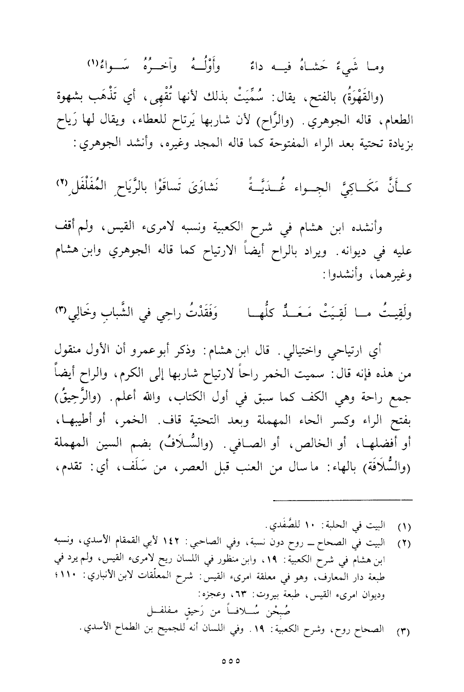 وأنشده ابن هشام في شرح الكعبية ونسبه لامرئ القيس, ولم أقف عليه في ديوانه. ويراد بالرح أيضًا الارتياح كما قاله الجوهري وابن هشام وغيرهما, وأنشدوا:
