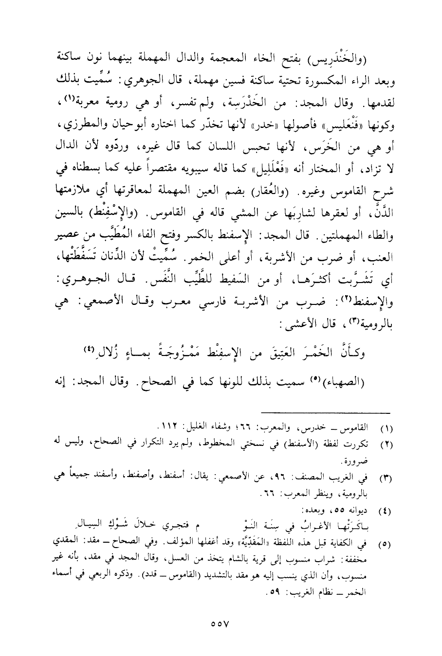 (والخندريس) بفتح الخاء المعجمة والدال المهملة بينهما نون ساكنة وبعد الراء المكسورة تحتية ساكنة فسين مهملة, قال الجوهري: سميت بذلك لقدمها. وقال المجد: من الخدرسة, ولم تفسر, أو هي رومية معربة, وكونها «فنعليس» فأصولها «خدر» لأنها تخدر كما اختاره أبو حيان والمطرزي, أو هي من الخرس, لأنها تحبس اللسان كما قال غيره, وردوه لأن الدال لا تزاد, أو المختار أنه «فعلليل» كما قاله سيبويه مقتصرًا عليه كما بسطناه في شرح القاموس وغيره. (والعقار) بضم العين المهملة لمعاقرتها أي ملازمتها الدن, أو لعقرها لشاربها عن المشي قاله في القاموس. (والإسفنط) بالسين والطاء المهملتين. قال المجد: الإسفنط بالكسر وفتح الفاء المطيب من عصير العنب, أو ضرب من الأشربة, أو على الخمر. سميت لأن الدنان تفطتها, أي تشربت أكثرها, أو من السفيط للطيب النفس. قال الجوهري: والإسنفط: ضرب من الأشربة فارسي معرب وقال الأصمعي: هي بالرومية, قال الأعشى: