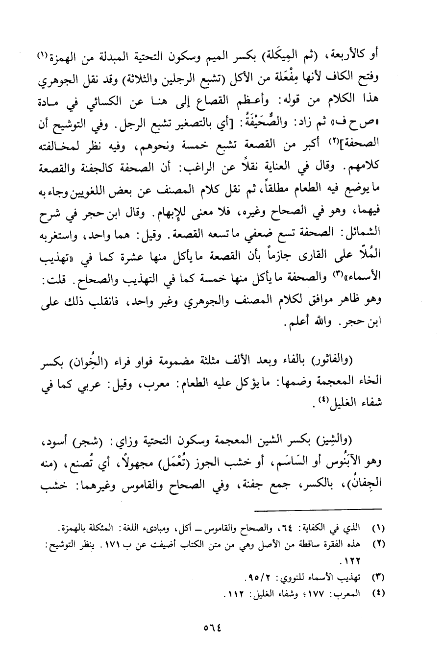 أو كالأربعة, (ثم الميكلة) بكسر الميم وسكون التحتية المبدلة من الهمزة وفتح الكاف لأنها مفعلة من الأكل (تشبع الرجلين والثلاثة) وقد نقل الجوهري هذا الكلام من قوله: وأعظم القصاع إلى هنا عن الكسائي في مادة «ص ح ف» ثم زاد: والصحيفة: [أي بالتصغير تشبع الرجل. وفي التوشيح أن الصحفة] أكبر من القصعة تشبع خمسة ونحوهم, وفيه نظر لمخالفته كلامهم. وقال في العناية نقلًا عن الراغب: أن الصحفة كالجفنة والقصعة ما يوضع فيه الطعام مطلقًا, ثم نقل كلام المصنف عن بعض اللغويين وجاء به فيهما, وهو في الصاحح وغيره, فلا معنى للإبهام. وقال ابن حجر في شرح الشمائل: الصحفة تسع ضعفي ما تسعه القصعة. وقيل: هما واحدو واستغربه الملا على القارئ جازمًا بأن القصعة ما يأكل منها عشرة كما في «تهذيب الأسماء» والصحفة ما يأكل منها خمسة كما في التهذيب والصحاح. قلت: وهو ظاهر موافق لكلام المصنف والجوهري وغير واحد, فانقلب ذلك على ابن حجر. والله أعلم.