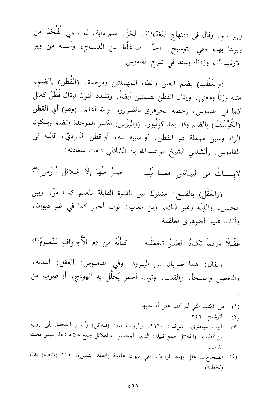 وإبريسم. وقال في «منهاج اللغة»: الخز: اسم دابة, ثم سمي المتخذ من وبرها بها, وفي التوشيح: الخز: ما غلظ من الديباج, وأصله من وبر الأرنب, وزدناه بسطًا في شرح القاموس.