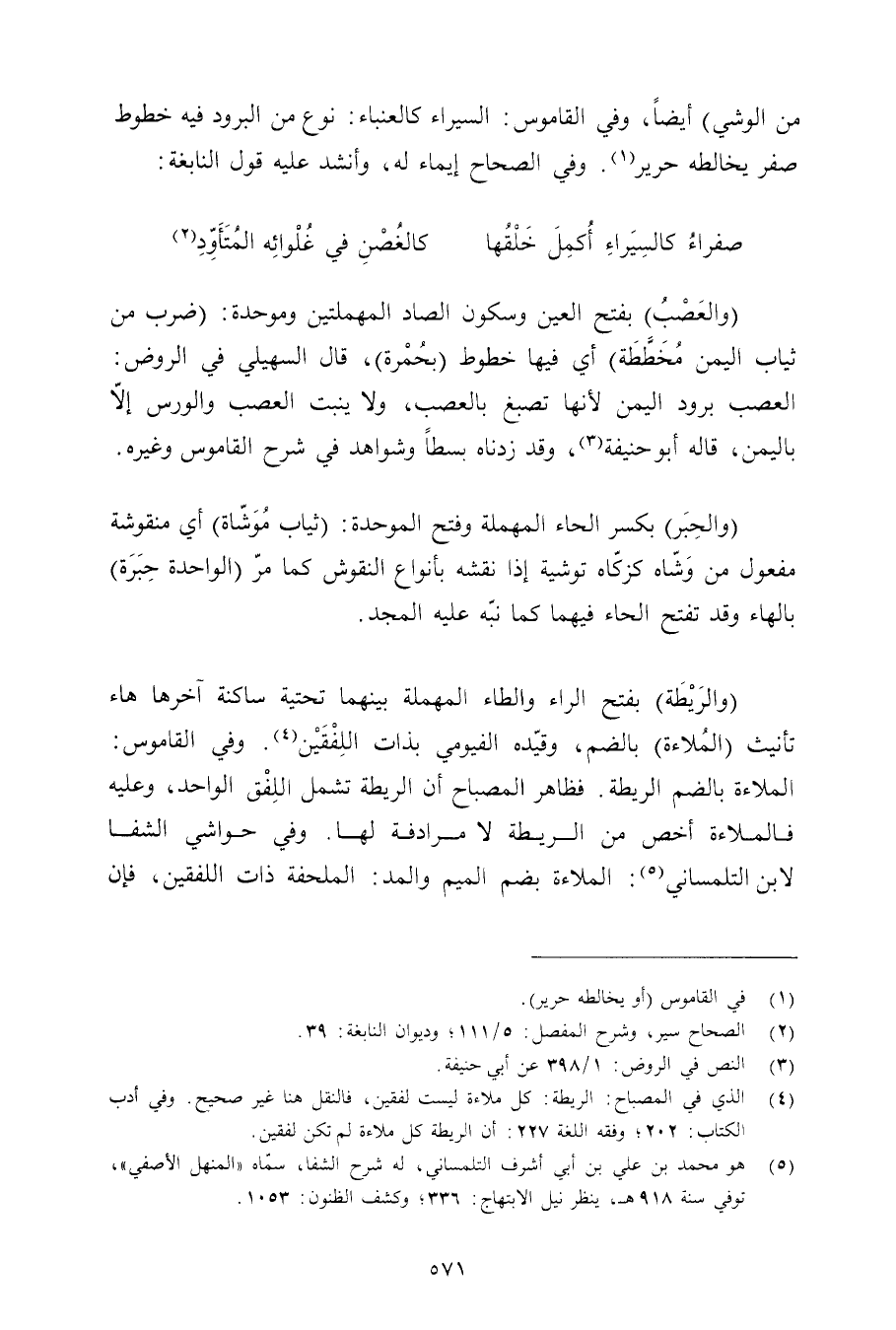 من الوشي) أيضًا, وفي القاموس: السيراء كالعنباء: نوع من البرود فيه خطوط صفر يخالطه حرير. وفي الصحاح إيماء له, وأنشد عليه قول النابغة: