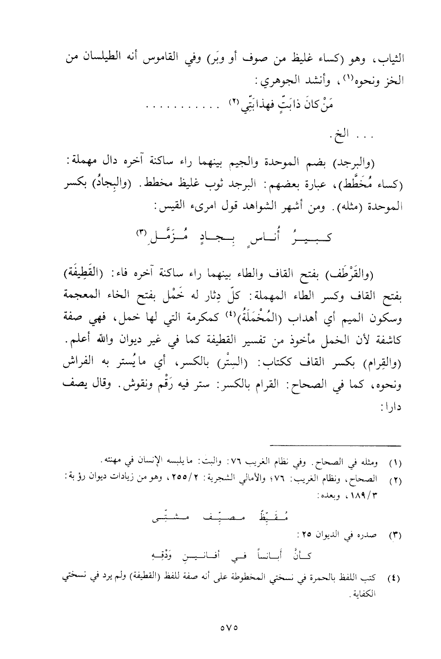 (والقرطف) بفتح القاف والطاء بينهما راء ساكنة آخره فاء: (القطيفة) بفتح القاف وكسر الطاء المهملة: كل دثار له خمل بفتح الخاء المعجمة وسكون الميم أي أهداب (المخملة) كمكرمة التي لها خمل, فهي صفة كاشفة لأن الخمل مأخوذ من تفسير القطيفة كما في غير ديوان والله أعلم. (والقرام) بكسر القاف ككتاب: (الستر) بالكسر, أي ما يستر به الفراش ونحوه, كما في الصحاح: القرام بالكسر: ستر فيه رقم ونقوش. وقال يصف دارا: