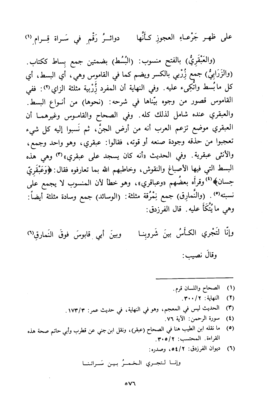 (والعبقري) بالفتح منسوب: (البسط) بضمتين جمع بساط ككتاب. (والزرابي) جمع زربي بالكسر ويضم كما في القاموس وهي, أي البسط, أي كل ما بسط واتكئ عليه. وفي النهاية أن المفرد زربية مثلثة الزاي: ففي القاموس قصور من وجوه بيانها في شرحه: (نحوها) من أنواع البسط. والعبقري عنده شامل لذلك كله. وفي الصحاح والقاموس وغيرهما أن العبقري موضع تزعم العرب أنه من أرض الجن, ثم نسبوا إليه كل شيء تعجبوا من حذقه وجودة صنعه أو قوته, فقالوا: عبقري, وهو واحد وجمع, والأنثى عبقرية. وفي الحديث «أنه كان يسجد على عبقري» وهي هذه البسط التي فيها الأصباغ والنقوش, وخاطبهم الله بما تعارفوه فقال: {وعبقري حسان} وقرأه بعضهم «وعباقري» , وهو خطأ لأن المنسوب لا يجمع على نسبته. (والنمارق) جمع نمرقة مثلثة: (الوسائد) جمع وسادة مثلثة أيضًا: وهي ما يتكأ عليه. قال الفرزدق: