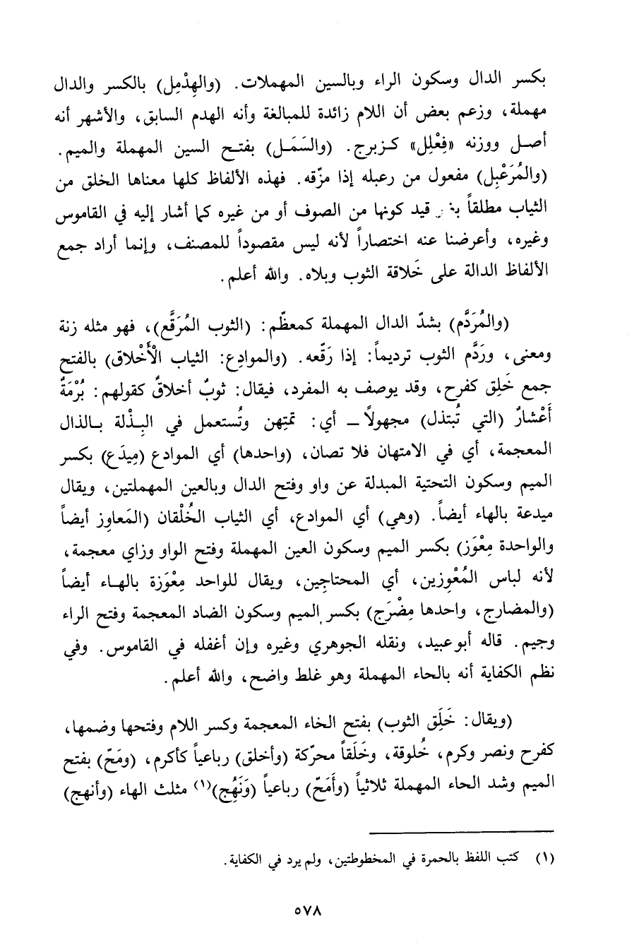 بكسر الدال وسكون الراء وبالسين المهملات. (والهدمل) بالكسر والدال مهملة, وزعم بعض أن اللام زائدة للمبالغة وأنه الهدم السابق, والأشهر أنه أصل ووزنه «فعلل» كزبرج. (والسمل) بفتح السين المهملة والميم. (والمرعبل) مفعول من رعبله إذا مزقه. فهذه الألفاظ كلها معناها الخلق من الثياب مطلقًا بغير قيد كونها من الصوف أو من غيره كما أشار إليه في القاموس وغيره, وأعرضنا عنه اختصارًا لأنه ليس مقصودًا للمصنف, وإنما أراد جمع الألفاظ الدالة على خلافة الثوب وبلاه. والله أعلم.