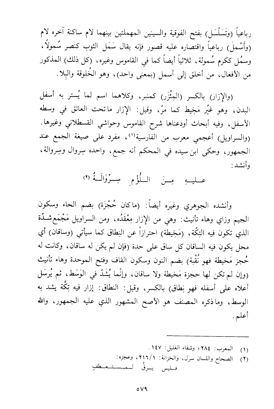 (والإزار) بالكسر (المئزر) كمنبر, وكلاهما اسم لما يُستر به أسفل البدن, وهو غير مخيط كما مر, وقيل: الإزار ما تحت العاتق في وسطه الأسفل, وفيه أبحاث أودعناها شرح القاموس وحواشي القسطلاني وغيرها. (والسراويل) أعجمي معرب من الفارسية, مفرد على صيغة الجمع عند الجمهور, وحكى ابن سيده في المحكم أنه جمع, واحده سروال وسروالة, وأنشد: