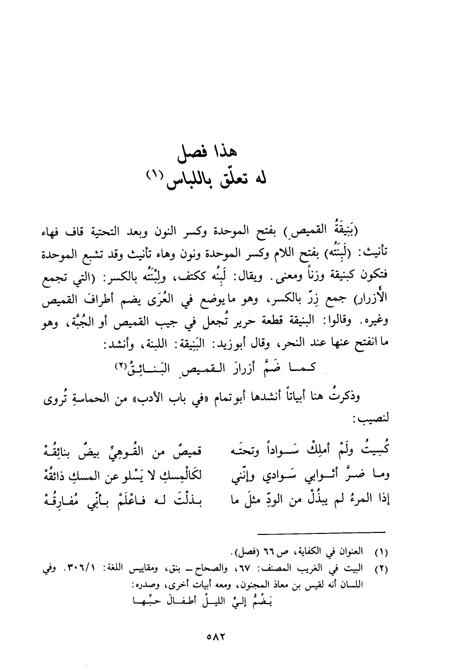 (بنيقة القميص) بفتح الموحدة وكسر النون وبعد التحتية قاف فهاء تأنيث: (لبنته) بفتح اللام وكسر الموحدة ونون وهاء تأنيث وقد تشبع الموحدة فتكون كبنيقة وزنًا ومعنى. ويقال: لبنه ككتف, ولبنته بالكسر: (التي تجمع الأزرار) جمع زر بالكسر, وهو ما يوضع في العرى يضم أطراف القميص وغيره. وقالوا: البنيقة قطعة حرير تجعل في جيب القميص أو الجبة, وهو ما انفتح عنها عند النحر, وقال أبو زيد: البنيقة: اللبنة, وأنشد: