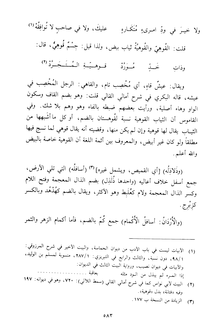 ويقال: عيش قاهٍ, أي مخصب تام, والقاهي: الرجل المخصب في عيشه, قاله البكري في شرح أمالي القالي قلت: وهو بضم القاف وسكون الواو وهاء أصلية, ورأيت بعضهم ضبطه بالفاء وهو وهم بلا شك. وفي القاموس أن الثياب القوهية نسبة لقوهستان بالضم, أو كل ما أشبهها من الثياب يقال لها قوهية وإن لم يكن منها, وقضيته أنه يقال قوهي لما نسج فيها مطلقًا ولو كان غير أبيض, والمعروف بين أئمة اللغة أن القوهية خاصة بالبيض والله أعلم.
