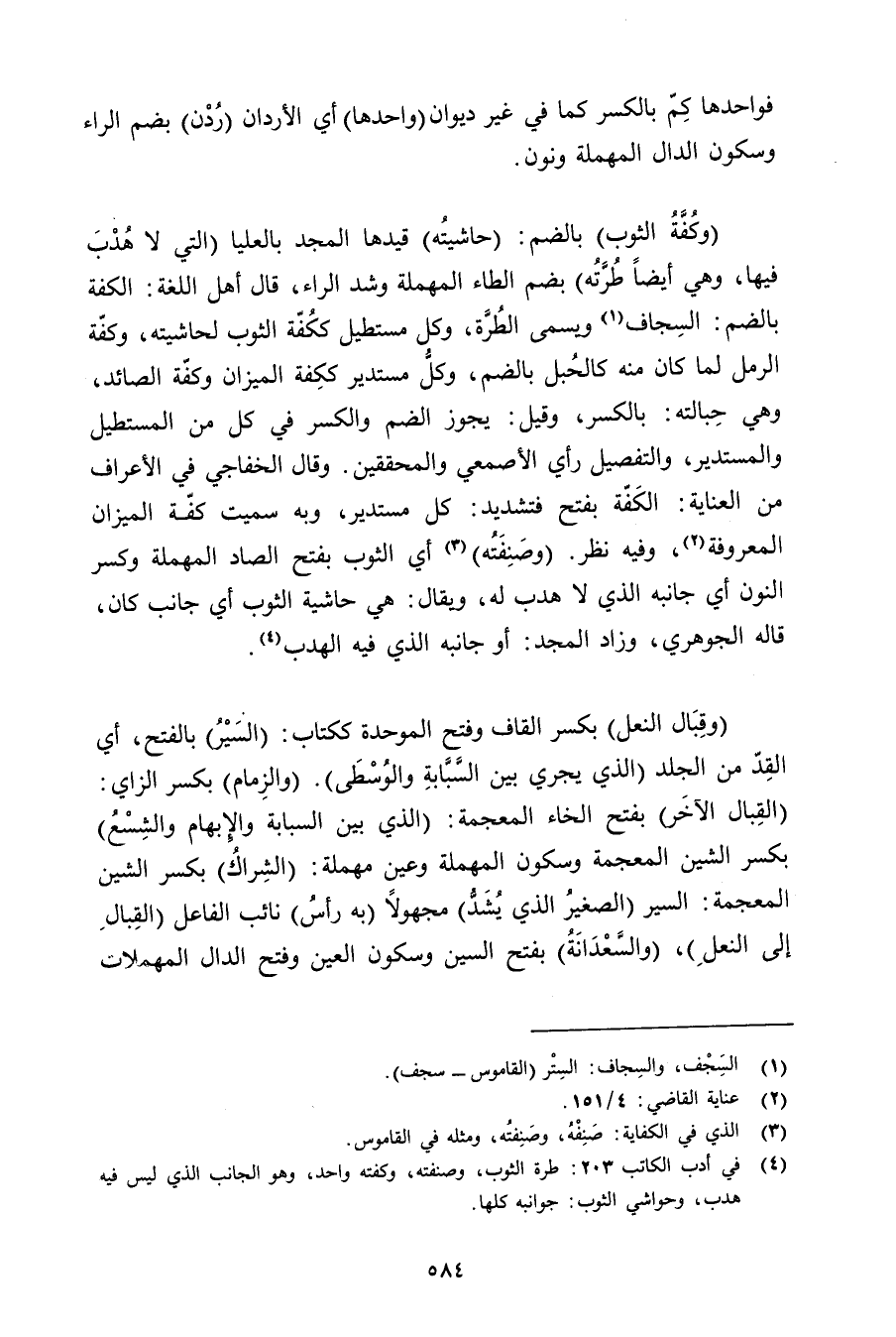 (وقبال النعل) بكسر القاف وفتح الموحدة ككتاب: (السير) بالفتح, أي القد من الجلد (الذي يجري بين السبابة والوسطى). (والزمام) بكسر الزاي: (القبال الآخر) بفتح الخاء المعجمة: (الذي بين السبابة والإبهام والشسع) بكسر الشين المعجمة وسكون المهملة وعين مهملة: (الشراك) بكسر الشين المعجمة: السير (الصغير الذي يشد) مجهولًا (به رأس) نائب الفاعل (القبال إلى النعل) , (والسعدانة) بفتح السين وسكون العين وفتح الدال المهملات