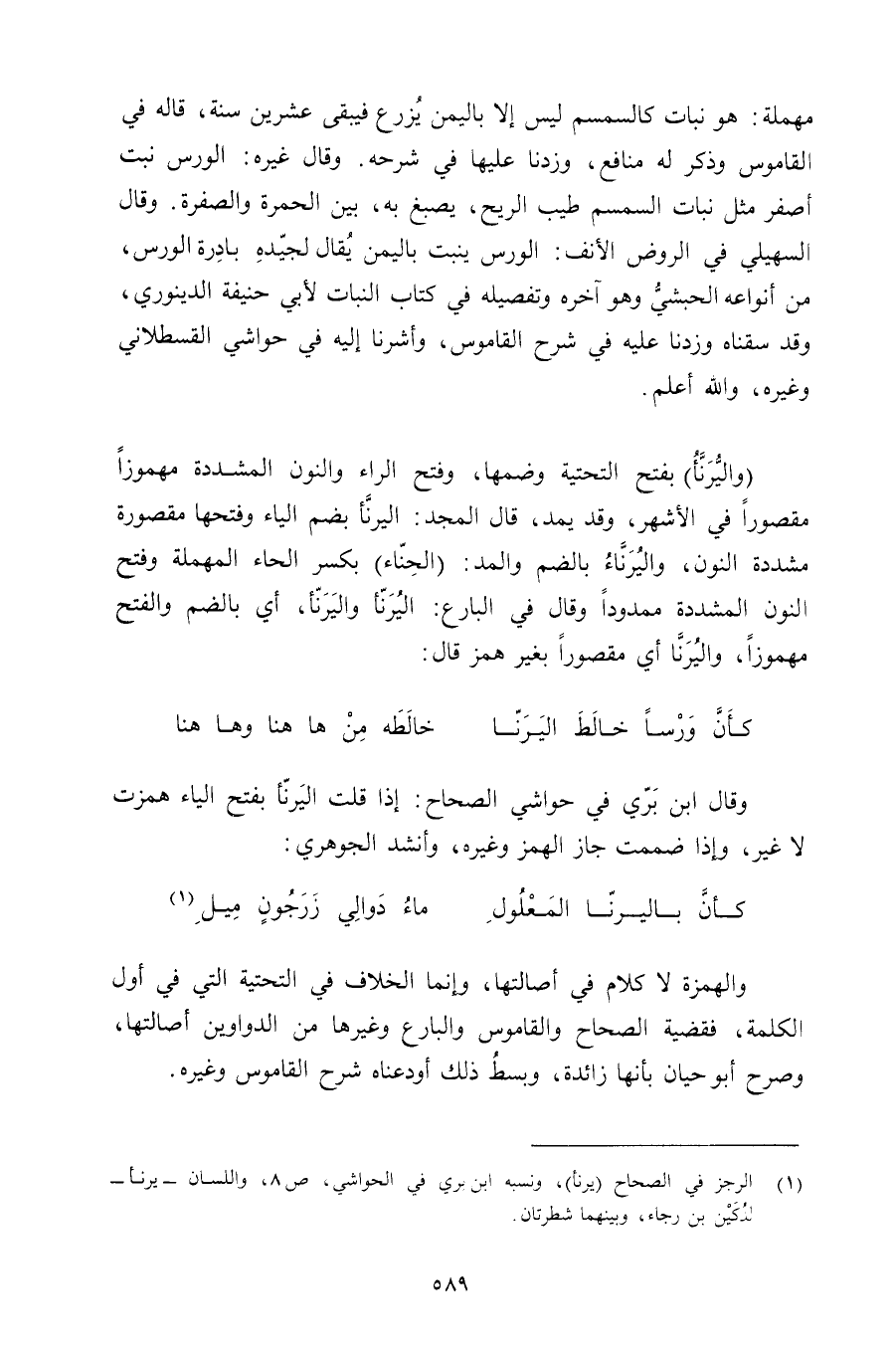 وقال ابن بري في حواشي الصحاح: إذا قلت اليرنأ بفتح الياء همزت لا غير, وإذا ضممت جاز الهمز وغيره, وأنشد الجوهري: