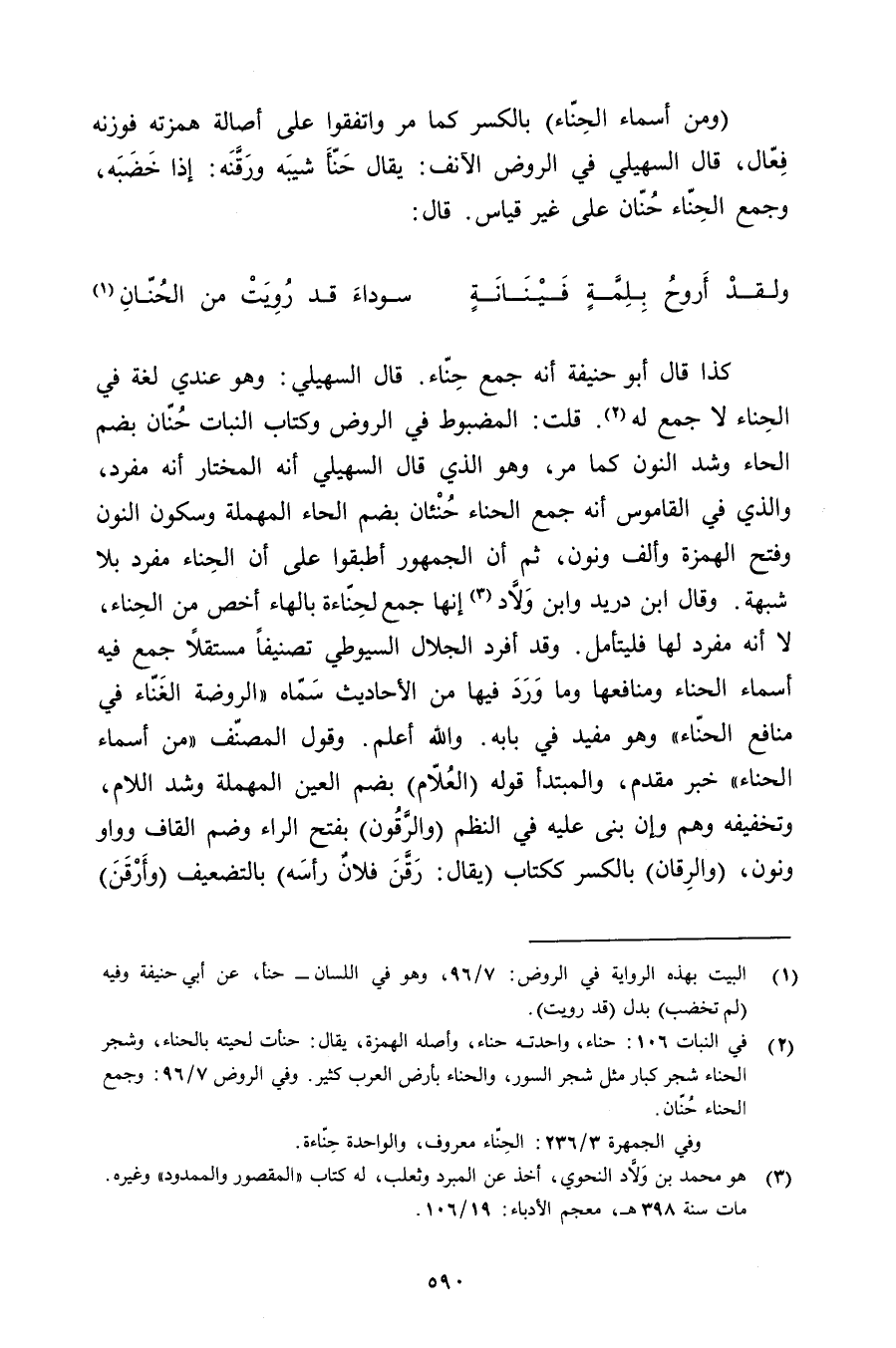 كذا قال أبو حنيفة أنه جمع حناء. قال السهيلي: وهو عندي لغة في الحناء لا جمع له. قلت: المضبوط في الروض وكتاب النبات حنان بضم الحاء وشد النون كما مر, وهو الذي قال السهيلي أنه المختار أنه مفرد, والذي في القاموس أنه جمع الحناء حنئان بضم الحاء المهملة وسكون النون وفتح الهمزة وألف ونون, ثم أن الجمهور أطبقوا على أن الحناء مفرد بلا شبهة. وقال ابن دريد وابن ولاد إنها جمع لحناءة بالهاء أخص من الحناء, لا أنه مفرد لها فليتأمل. وقد أفرد الجلال السيوطي تصنيفًا مستقلًا جمع فيه أسماء الحناء ومنافعها وما ورد فيها من الأحاديث سماه «الروضة الغناء في منافع الحناء» وهو مفيد في بابه. والله أعلم. وقول المصنف «من أسماء الحناء» خبر مقدم, والمبتدأ قوله (العلام) بضم العين المهملة وشد اللام, وتخفيفه وهم وإن بنى عليه في النظم (والرقون) بفتح الراء وضم القاف وواو ونون, (والرقان) بالكسر ككتاب (يقال: رقن فلان رأسه) بالتضعيف (وأرقن)