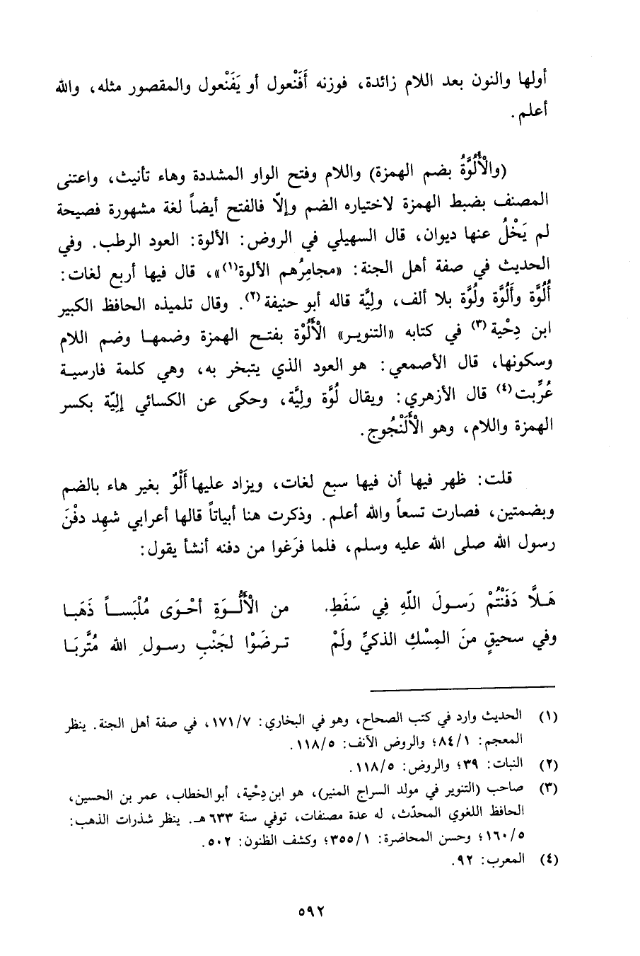 قلت: ظهر فيها أن فيها سبع لغات, ويزاد عليها ألو بغير هاء بالضم وبضمتين, فصارت تسعًا والله أعلم. وذكرت هنا أبياتًا قالها أعرابي شهد دفن رسول الله صلى الله عليه وسلم, فلما فرغوا من دفنه أنشأ يقول: