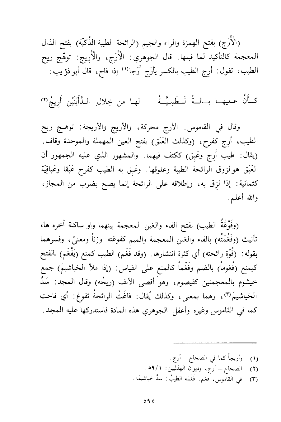 (الأرج) بفتح الهمزة والراء والجيم (الرائحة الطيبة الذكية) بفتح الذال المعجمة كالتأكيد لما قبلها. قال الجوهري: الأرج, والأريج: توهج ريح الطيب, تقول: أرج الطيب بالكسر يأرج أرجا إذا فاح, قال أبو ذؤيب: