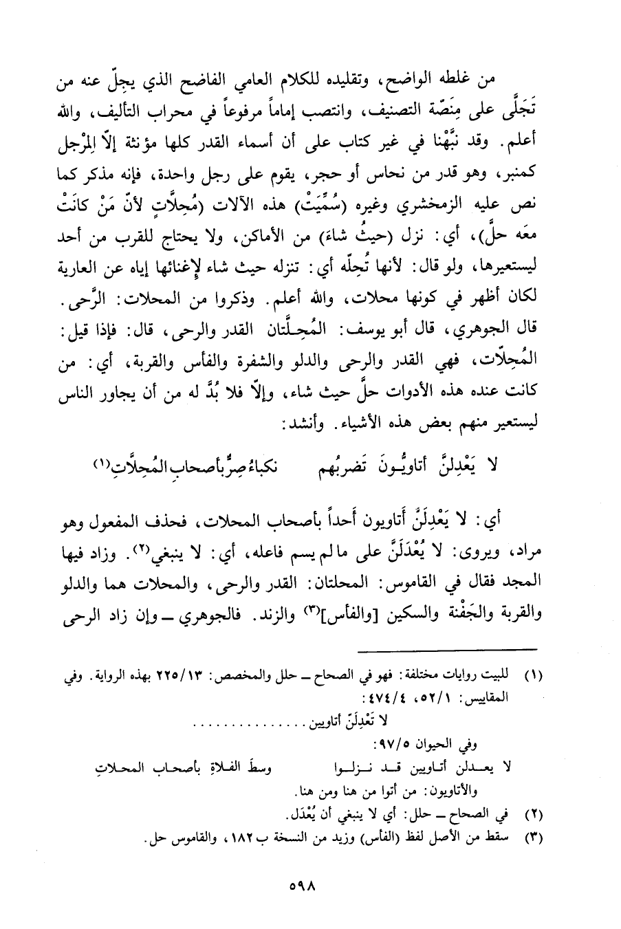 من غلطه الواضح, وتقليده للكلام العامي الفاضح الذي يجل عنه من تجلى عى منصة التصنيف, وانتصب إمامًا مرفوعًا في محراب التأليف, والله أعلم. وقد نبهنا في غير كتاب على أن أسماء القدر كلها مؤنثة إلا المرجل كمنبر, وهو قدر من نحاس أو حجر, يقوم على رجل واحدة, فإنه مذكر كما نص عليه الزمخشري وغيره (سميت) هذه الآلات (محلات لأن من كانت معه حل) , أي: نزل (حيث شاء) من الأماكن, ولا يحتاج للقرب من أحد ليستعيرها, ولو قال: لأنها تحله أي: تنزله حيث شاء لإغنائها إياه عن العارية لكان أظهر في كونها محلات, والله أعلم. وذكروا من المحلات: الرحى.