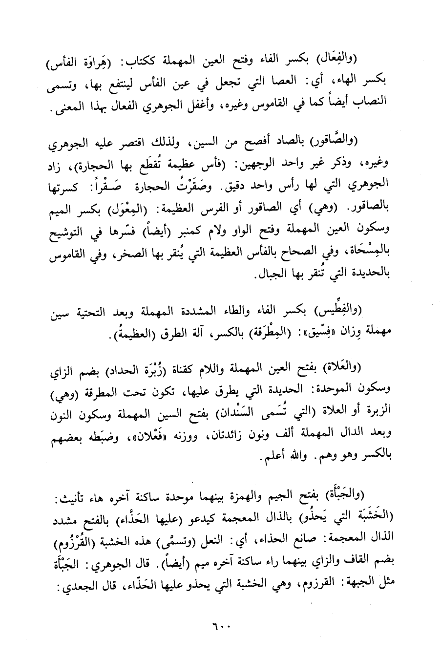 (والفعال) بكسر الفاء وفتح العين المهملة ككتاب: (هراوة الفأس) بكسر الهاء, أي: العصا التي تجعل في عين الفأس لينتفع بها, وتسمى النصاب أيضًا كما في القاموس وغيره, وأغفل الجوهري الفعال بهذا المعنى.