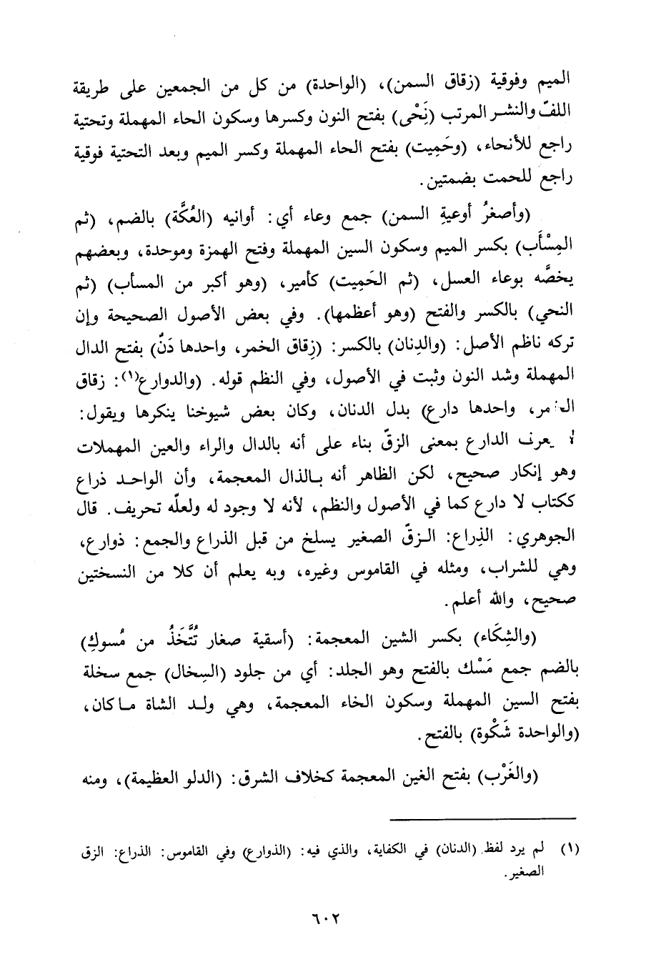 (وأصغر أوعية السمن) جمع وعاء أي: أوانيه (العكة) بالضم, (ثم المسأب) بكسر الميم وسكون السين المهملة وفتح الهمزة وموحدة, وبعضهم يخصه بوعاء العسل, (ثم الحميت) كأمير, (وهو أكبر من المسأب) (ثم النحي) بالكسر والفتح (وهو أعظمها). وفي بعض الأصول الصحيحة وإن تركه ناظم الأصل: (والدنان) بالكسر: (زقاق الخمر, واحدها دن) بفتح الدال المهملة وشد النون وثبت في الأصول, وفي النظم قوله. (والدوارع: زقاق ***, واحدها دارع) بدل الدنان, وكان بعض شيوخنا ينكرها ويقول: *** الدراع بمعنى الزق بناء على أنه بالدال والراء والعين المهملات وهو إنكار صحيح, لكن الظاهر أنه بالذال المعجمة, وأن الواحد ذراع ككتاب لا دارع كما في الأصول والنظم, لأنه لا وجود له ولعله تحريف. قال الجوهري: الذراع: الزق الصغير يسلخ من قبل الذراع والجمع: ذوارع, وهي للشراب, ومثله في القاموس وغيره, وبه يعلم أن كلا من النسختين صحيح, والله أعلم.