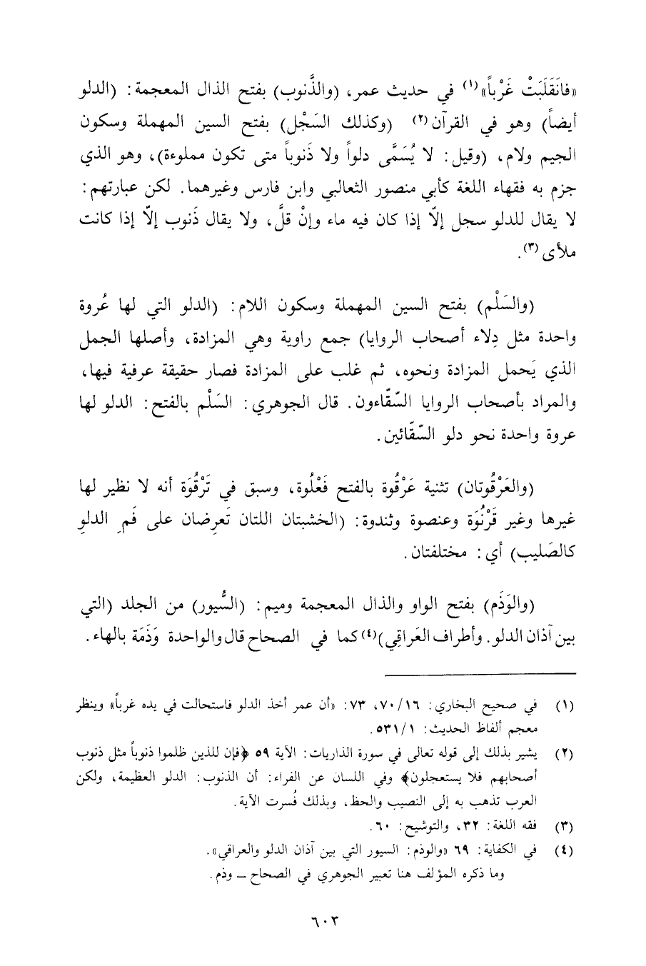 «فانقلبت غربًا» في حديث عمر, (والذنوب) بفتح الذال المعجمة: (الدلو أيضًا) وهو في القرآن (وكذلك السجل) بفتح السين المهملة وسكون الجيم ولام, (وقيل: لا يسمى دلوًا ولا ذنوبًا متى تكون مملوءة) , وهو الذي جزم به فقهاء اللغة كأبي منصور الثعالبي وابن فارس وغيرهما. لكن عبارتهم: لا يقال للدلو سجل إلا إذا كان فيه ماء وإن قل, ولا يقال ذنوب إلا إذا كانت ملأى.