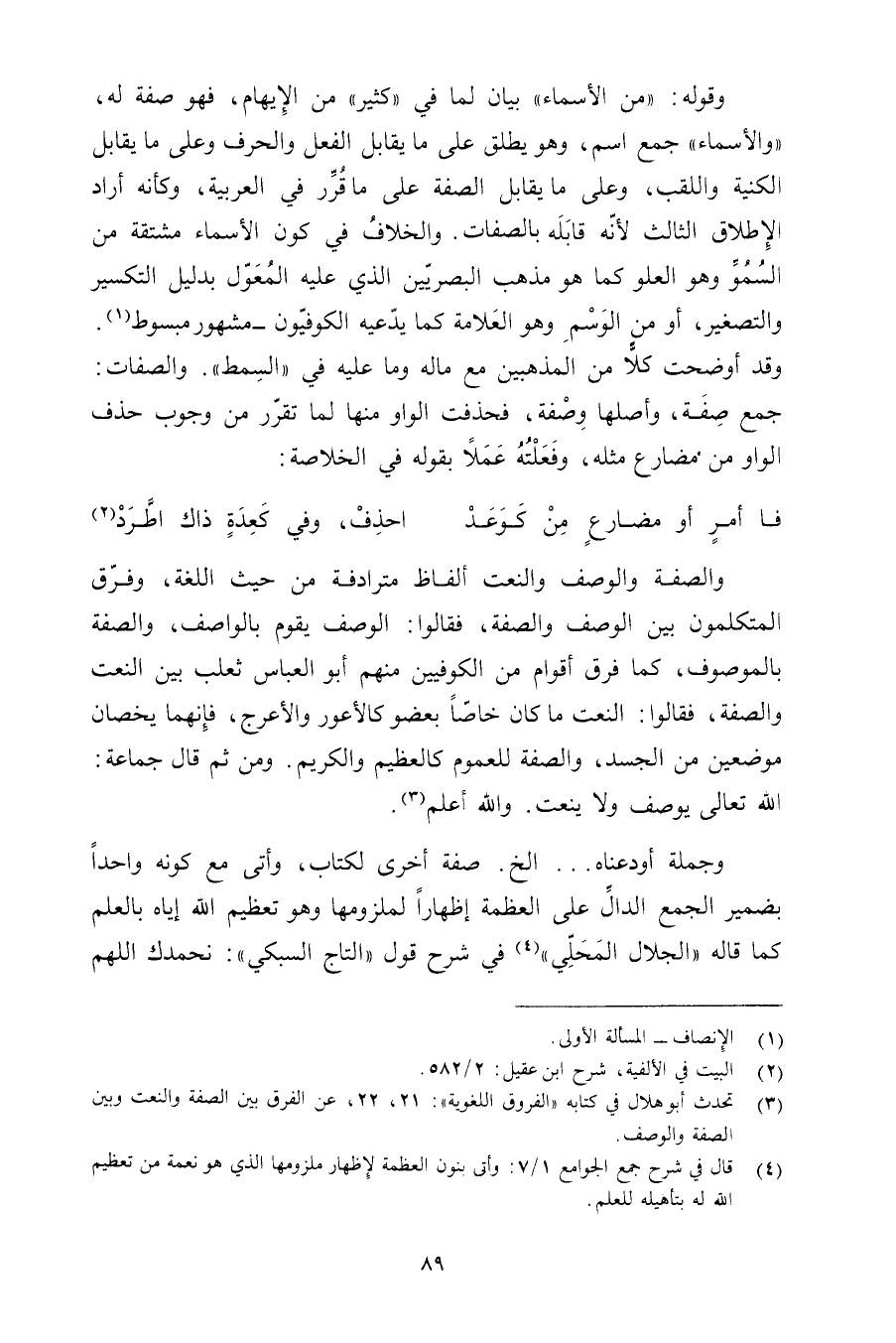 وقوله: «من الأسماء» بيان لما في «كثير» من الإيهام, فهو صفة له, «والأسماء» جمع اسم, وهو يطلق على ما يقابل الفعل والحرف وعلى ما يقابل الكنية واللقب, وعلى ما يقابل الصفة على ما قرر في العربية, وكأنه أراد الإطلاق الثالث لأنه قابله بالصفات. والخلاف في كون الأسماء مشتقة من السمو وهو العلو كما هو مذهب البصريين الذي عليه المعول بدليل التكسير والتصغير, أو من الوسم وهو العلامة كما يدعيه الكوفيون - مشهور مبسوط. وقد أوضحت كلا من المذهبين مع ماله وما عليه في «السمط». والصفات: جمع صفة, وأصلها وصفة, فحذفت الواو منها لما تقرر من وجوب حذف الواو من مضارع مثله, وفعلته عملًا بقوله في الخلاصة: