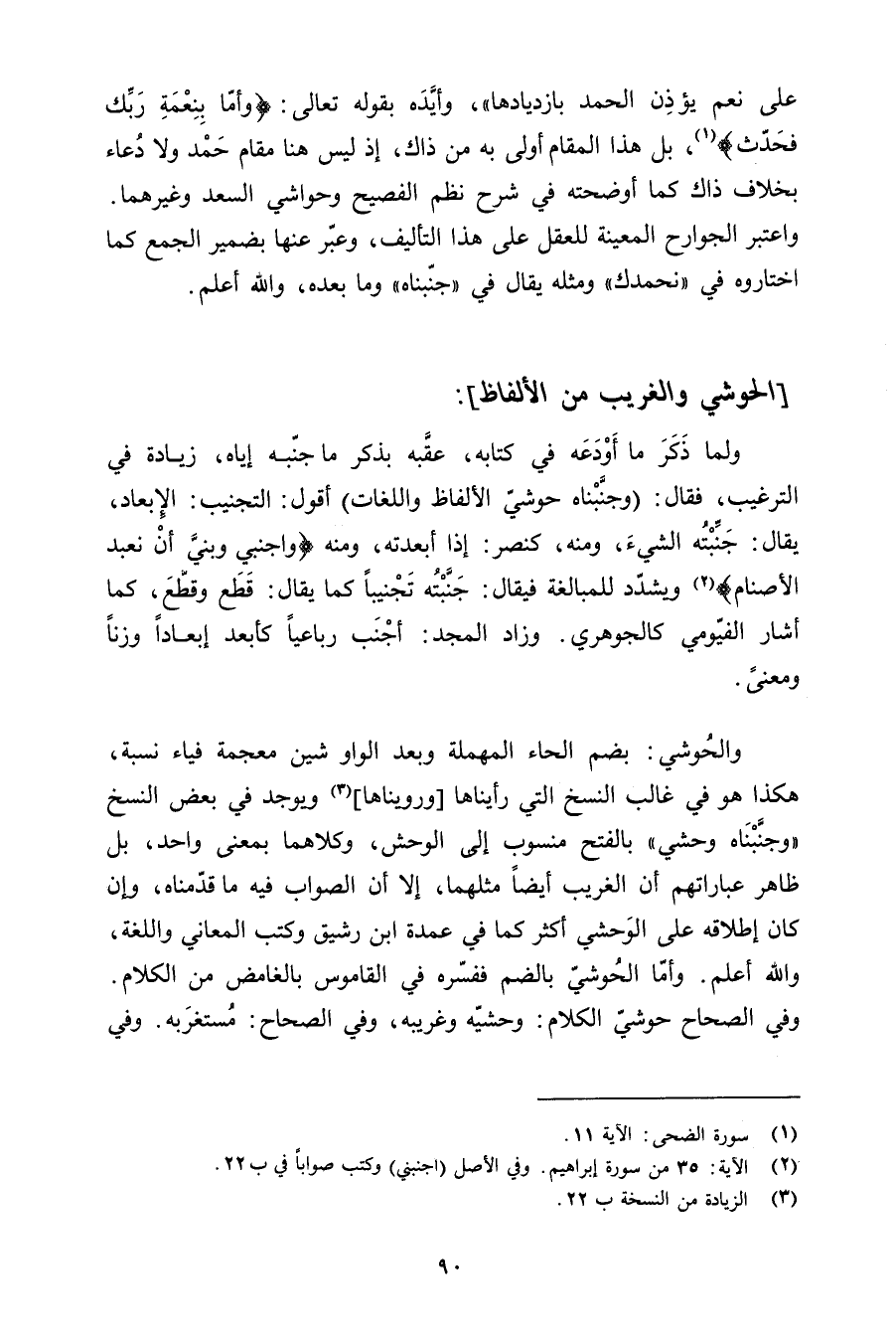 والحوشي: بضم الحاء المهملة وبعد الواو شين معجمة فياء نسبة, هكذا هو في غالب النسخ التي رأيناها [ورويناها] ويوجد في بعض النسخ «وجنبناه وحشي» بالفتح منسوب إلى الوحش, وكلاهما بمعنى واحد, بل ظاهر عبارتهم أن الغريب أيضًا مثلهما, إلا أن الصواب فيه ما قدمناه, وإن كان إطلاقه على الوحشي أكثر كما في عمدة ابن رشيق وكتب المعاني واللغة, والله أعلم. وأما الحوشي بالضم ففسره في القاموس بالغامض من الكلام. وفي الصحاح حوشي الكلام: وحشيه وغريبه, وفي الصحاح: مستغربه. وفي