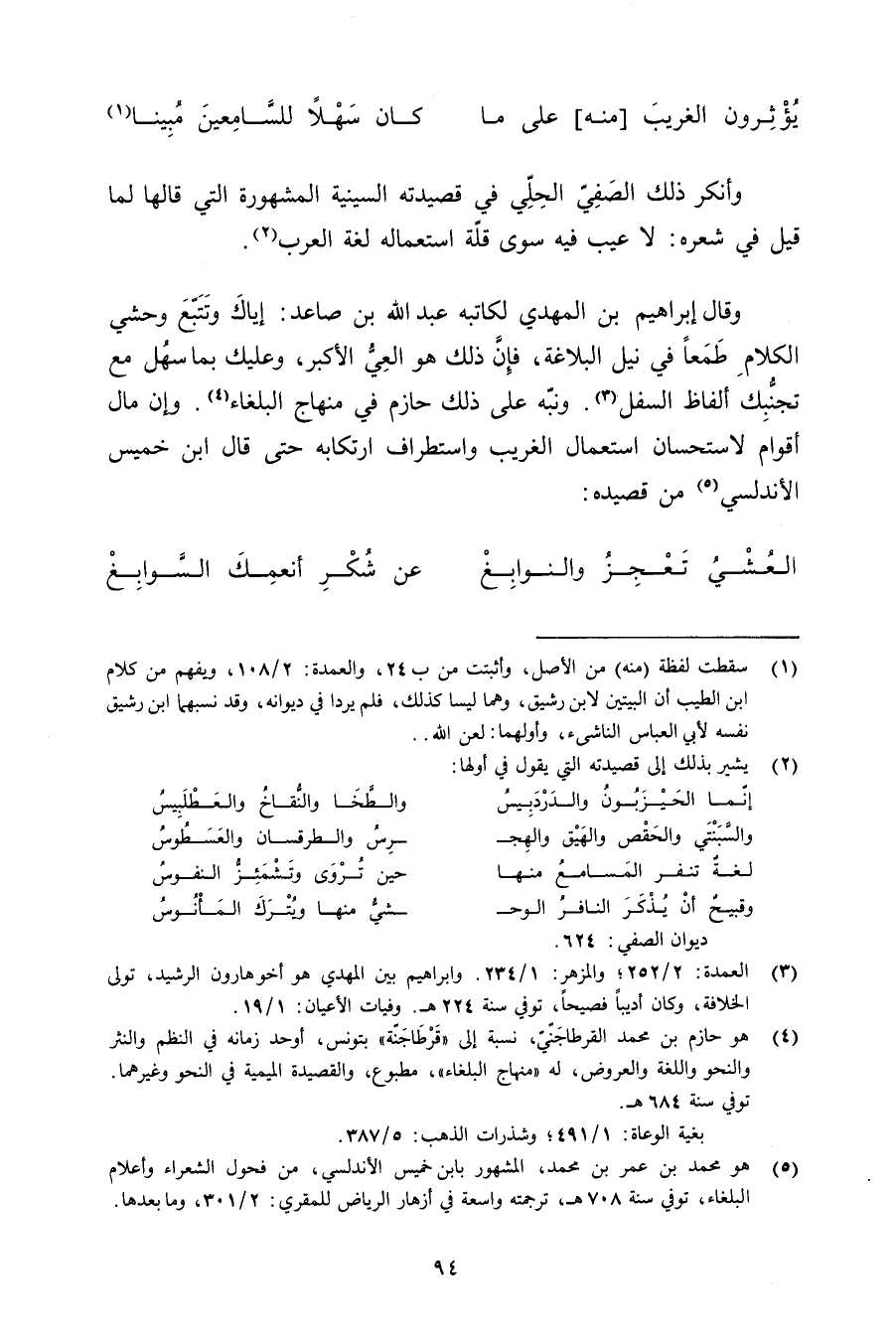 وقال إبراهيم بن المهدي لكاتبه عبد الله بن صاعد: إياك وتتبع وحشي الكلام طمعًا في نيل البلاغة, فإن ذلك هو العي الأكبر, وعليك بما سهل مع تجنبك ألفاظ السفل. ونبه على ذلك حازم في منهاج البلغاء. وإن مال أقوام لاستحسان استعمال الغريب واستطراف ارتكابه حتى قال ابن خميس الأندلسي من قصيده: