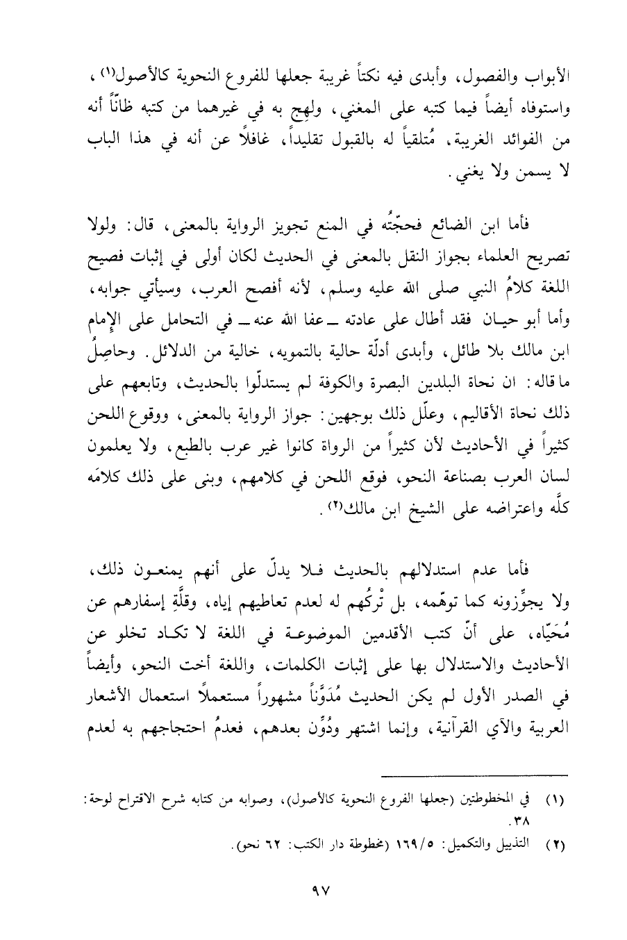 فأما ابن الضائع فحجته في المنع تجويز الرواية بالمعنى, قال: ولولا تصريح العلماء بجواز النقل بالمعنى في الحديث لكان أولى في إثبات فصيح اللغة كلام النبي صلى الله عليه وسلم, لأنه أفصح العرب, وسيأتي جوابه, وأما أبو حيان فقد أطال على عادته - عفا الله عنه - في التحامل على الإمام ابن مالك بلا طائل, وأبدى أدلة حالية بالتمويه, خالية من الدلائل. وحاصل ما قاله: إن نحاة البلدين البصرة والكوفة لم يستدلوا بالحديث, وتابعهم على ذلك نحاة الأقاليم, وعلل ذلك بوجهين: جواز الرواية بالمعنى, ووقوع اللحن كثيرًا في الأحاديث لأن كثيرًا من الرواة كانوا غير عرب بالطبع, ولا يعلمون لسان العرب بصناعة النحو, فوقع اللحن في كلامهم, وبنى على ذلك كلامه كله واعتراضه على الشيخ ابن مالك.